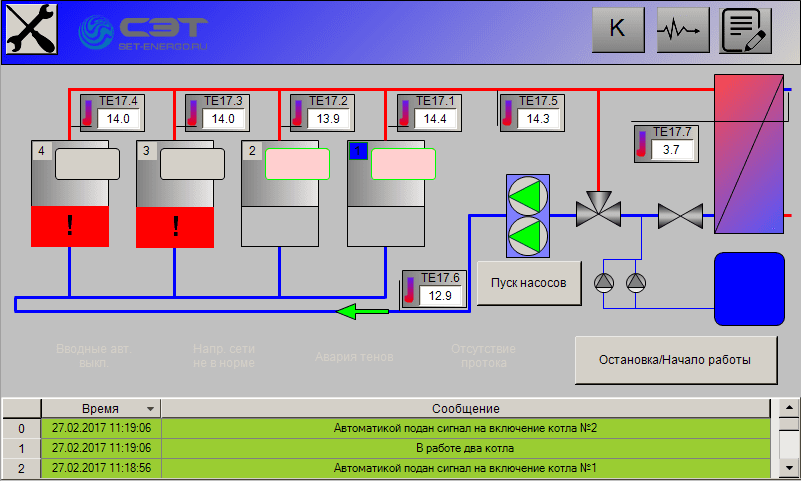 - Возможность изменения настроек уставок алгоритмов каскадного управления и режима работы насосов.