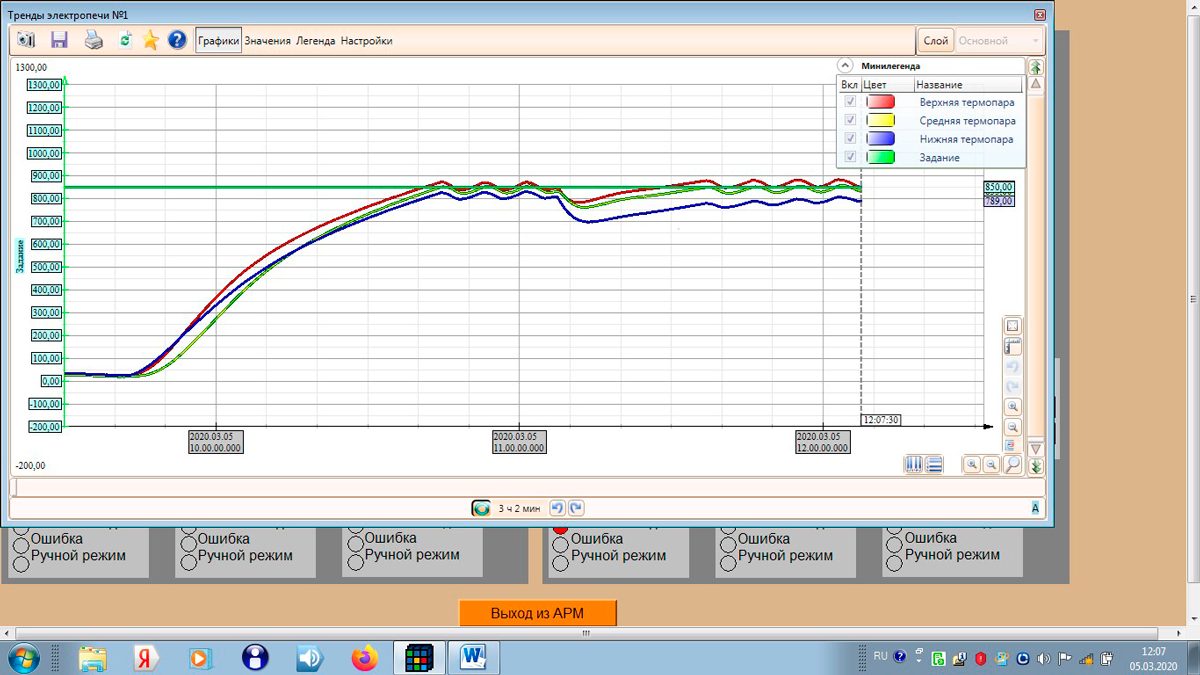 АРМ технолога-оператора отображает ход технологического процесса, позволяет анализировать его как оперативно, так и по завершении, на основании архивных данных.