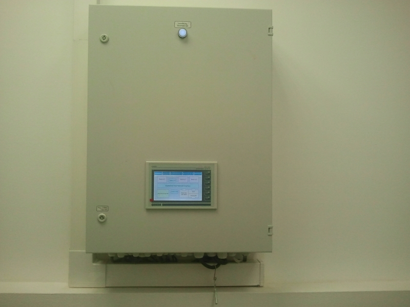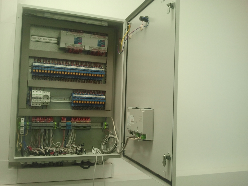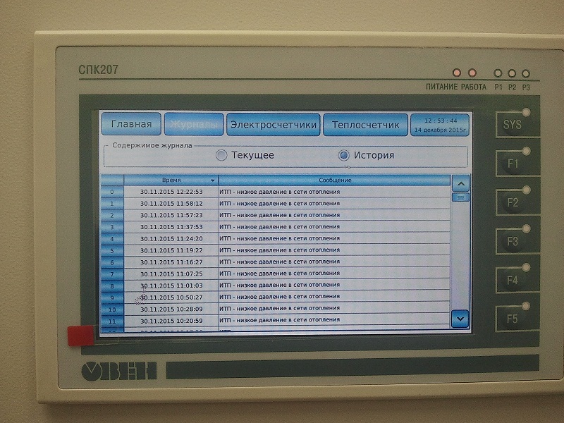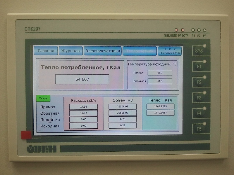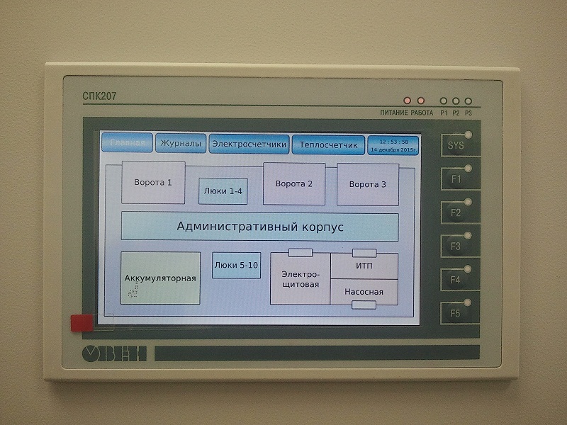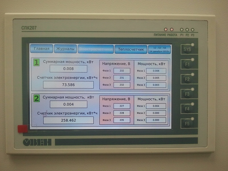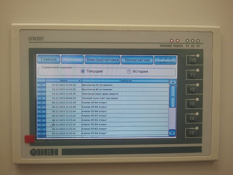 Для приема дискретных сигналов применены модули ввода дискретных сигналов ОВЕН МВ110-220.32ДН, подключенные к панели оператора по сети Modbus. Также по сети Modbus к панели оператора подключены теплосчетчик и электросчетчики здания. Для подключения к общей компьютерной сети используется порт Ethernet.