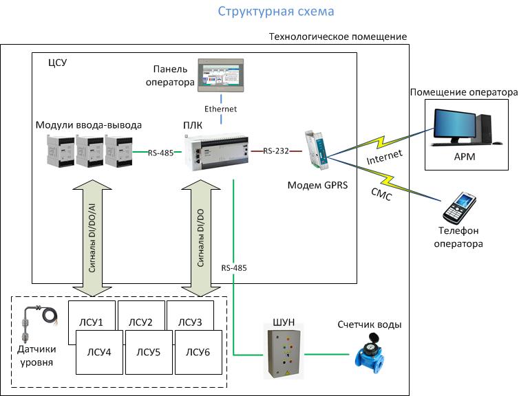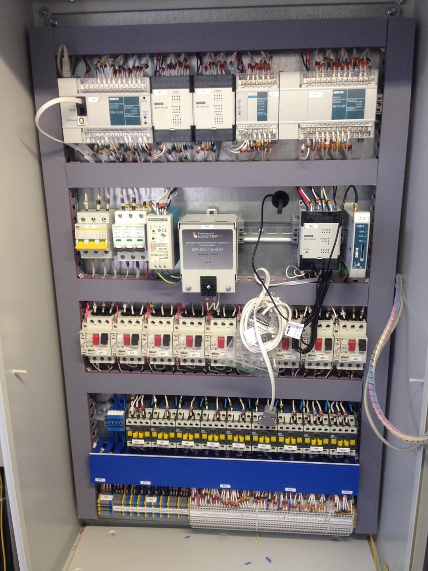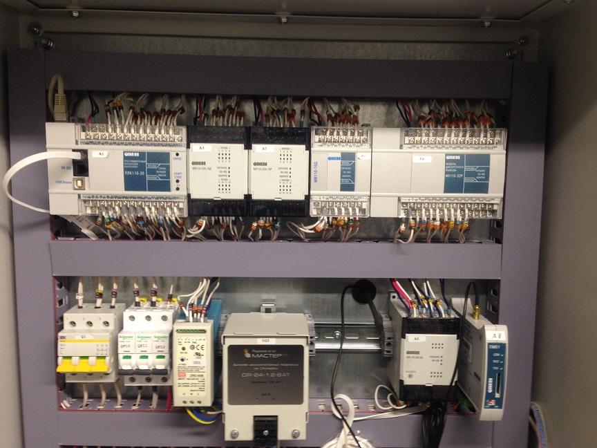 В основе системы управления – программируемый логический контроллер ОВЕН ПЛК110; модули ввода/вывода ОВЕН: МВ110-24.16Д, МУ110-24.32Р, МУ110-224.16Р, MB110-224.8A; GPRS-модем ОВЕН ПМ-01; датчики ОВЕН: кондуктометрический ДС2 и поплавковый с аналоговым выходным сигналом ПДУ-И.