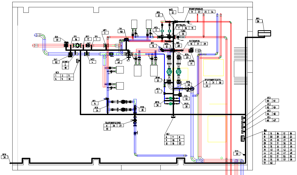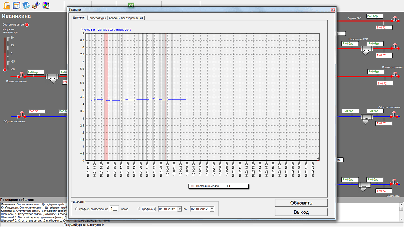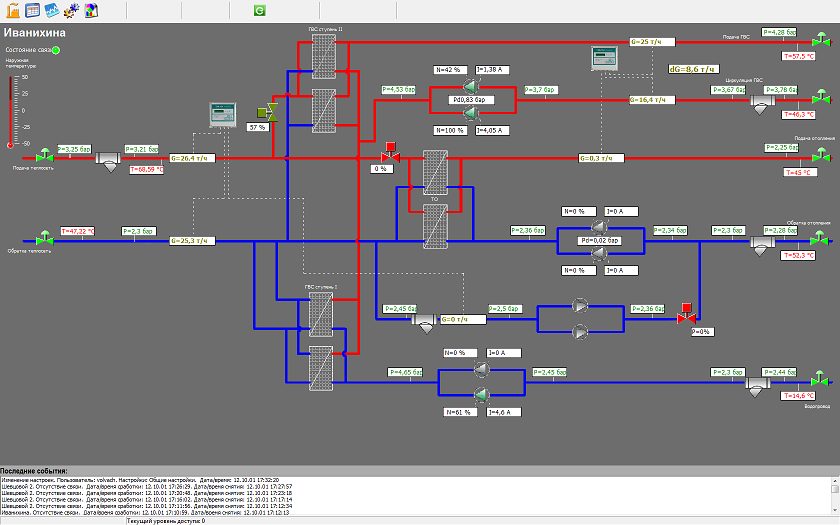 Мнемосхема ЦТП отображает параметры, передаваемые с контроллера теплового пункта, в удобном для оператора виде, показывает состояние оборудования и аварийные ситуации.
