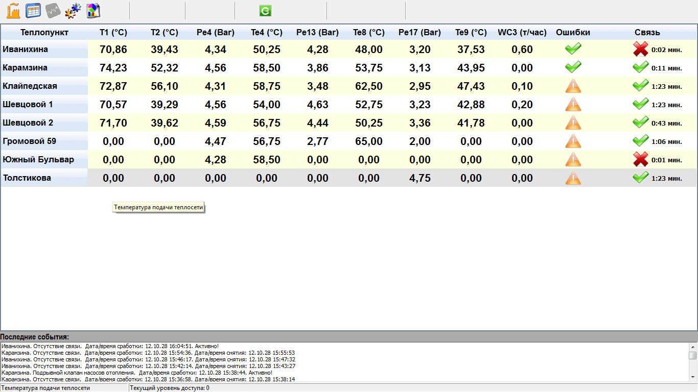 Основной экран (рис. 5) отображает технологически значимые параметры по каждому ЦТП, подключённому к системе, а также состояние каналов связи.