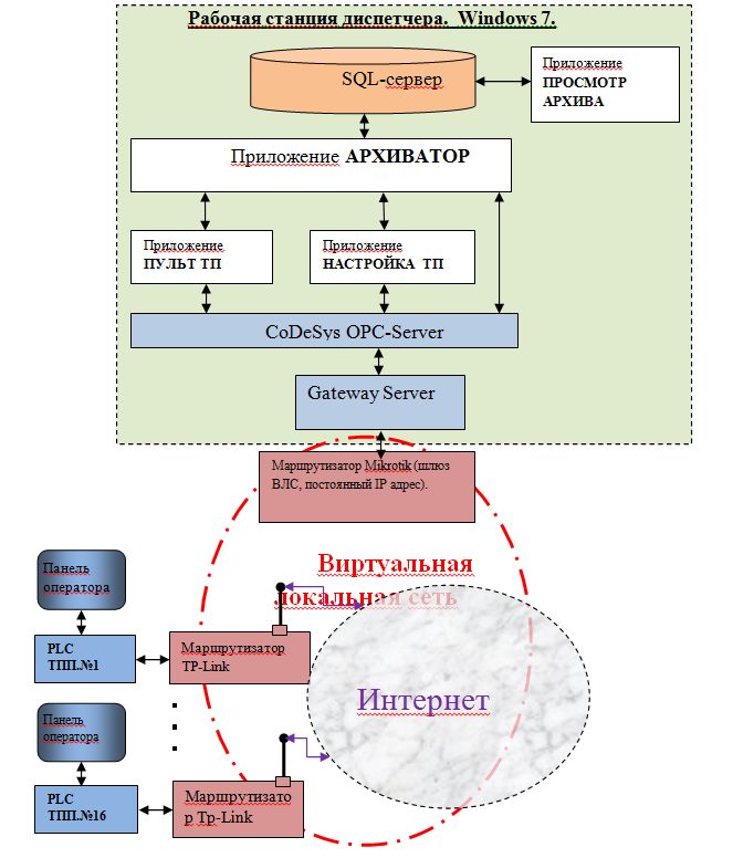Предлагаемый программно-аппаратный комплекс позволяет управлять центральными тепловыми пунктами (ЦТП), как с местной панели оператора, так и с автоматизированного рабочего места диспетчера тепловых сетей (или нескольких). Решение не требует прокладки дополнительных линий связи, так как передача данных на диспетчерскую производится в зашифрованном виде по каналам GSM, возможно применение других каналов связи при их наличии. Кроме того, данный комплекс может быть полезен в случаях, когда приходится часто изменять параметры системы теплоснабжения, при этом нет необходимости поездок на объект.