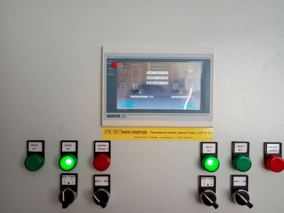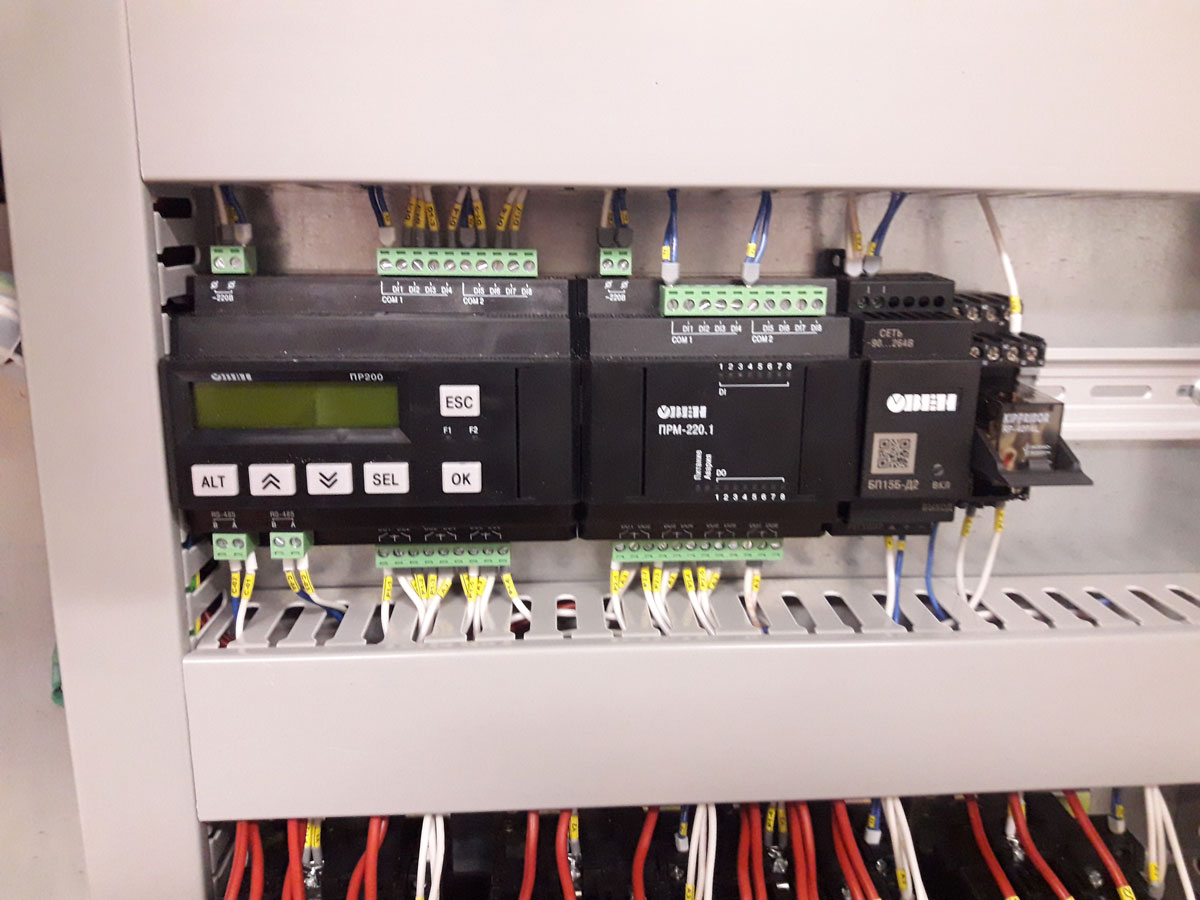 В проекте также использованы преобразователи частоты ОВЕН ПЧВ204-15К-В (2 шт.), вентиляторы VENT-12025.220VAC.5MSHB (2 шт.), блок питания автоматики ОВЕН БП30Б-Д3-5, светосигнальное оборудование Meyertec (кнопки, переключатели серии MTB2) и др.