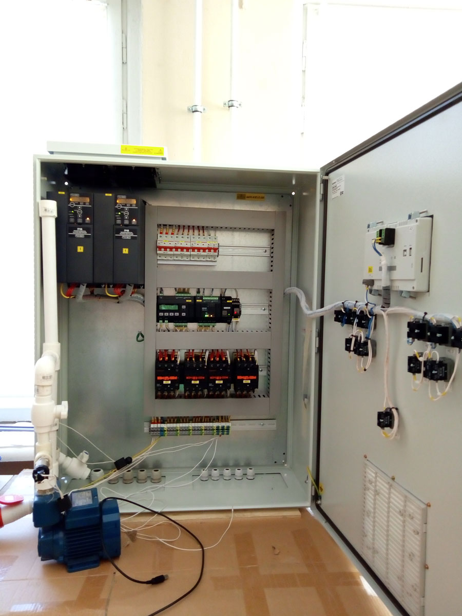 Шкаф автоматизации ЦТП с крышным вентилятором (для улучшения микроклимата шкафа, исключение перегрева ПЧВ) и управлением насосной группой на 30 кВт разработан на базе программируемого реле ОВЕН ПР200 и модуля рсширения ОВЕН ПРМ с сенсорным панельным контроллером ОВЕН СПК107.