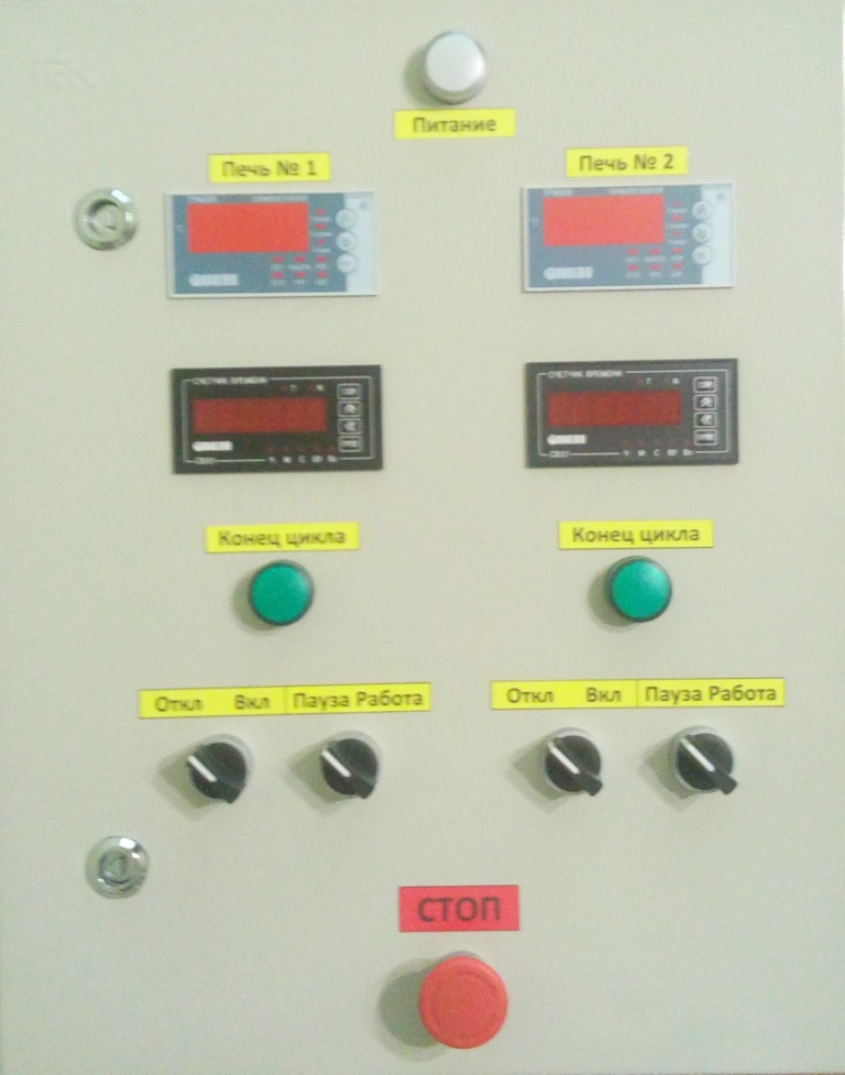 Шкаф управления проектировался для автоматизации работы двух электропечей, установленных в электроцехе для сушки обмоток электродвигателей.