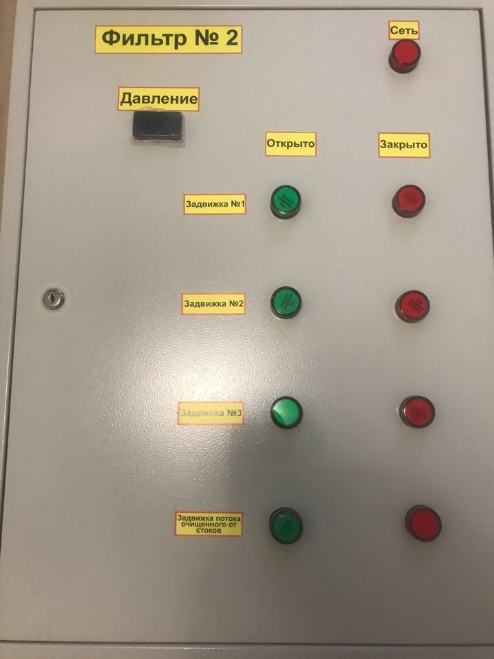 Основным элементом управления данной системы является программируемое реле ОВЕН ПР200. Алгоритм управления четырьмя фильтрами сточных вод загружен в программируемое реле ПР200. Все задвижки имеют электроприводы. На емкости каждого фильтра установлен датчик давления ОВЕН ПД100. Сигнал с датчика (4…20 мА) поступает через измеритель ОВЕН ИТП-11 (служит для отображения информации о давлении в емкостях) на ПР200, где сигнал сравнивается с «заданием», которое задает оператор на панели ПР200. При превышении сигнала «задания» с датчика давления фильтр переходит в режим промывки. Происходит закрытие задвижек на подачу и открытие задвижек для промывки фильтра. Время промывки фильтра задано в контроллере и имеет возможность корректировки на панели ПР200.
