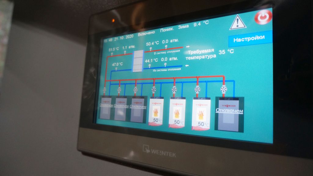 Для регулирования температуры ГВС и отопления используются два трехходовых регулирующих клапана, а также два клапана подпитки. Теплоноситель циркулирует по внутреннему (котловому) и внешним контурам отопления и ГВС. Создана система автоматизации, которая работает без постоянного присутствия обслуживающего персонала.