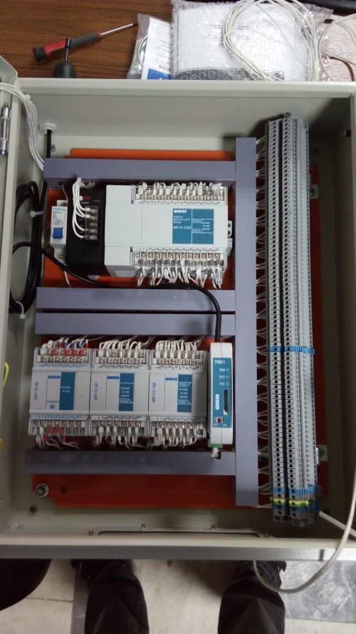 Система автоматики холодильных камер предназначена для поддержания минусовой температуры в 3-х камерах для охлаждения мясной продукции. Система автоматизации управляет 2-мя компрессорами в одной камере и 4-мя компрессорами в другой камере. Шкаф управления содержит панельный контроллер ОВЕН СПК207, аналоговый модуль ввода ОВЕН МВ110-8А, дискретные модули ввода ОВЕН МВ110-16Д и МВ110-32ДН, дискретный модуль вывода ОВЕН МУ110-8Р. Измерение температуры и влажности камеры осуществляется с помощью датчиков ОВЕН ПВТ100.