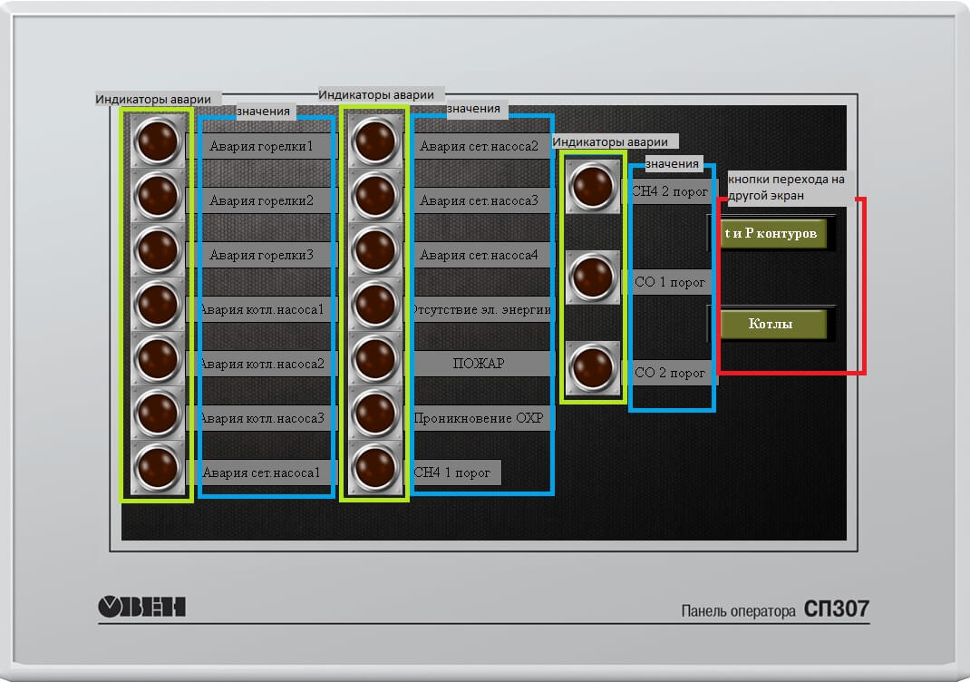 На диспетчерский компьютер передаются сигналы об авариях, сигналы состояния оборудования (работа насосов, горелок и т.п.), параметры газовой котельной (давление, температура и т.д.).