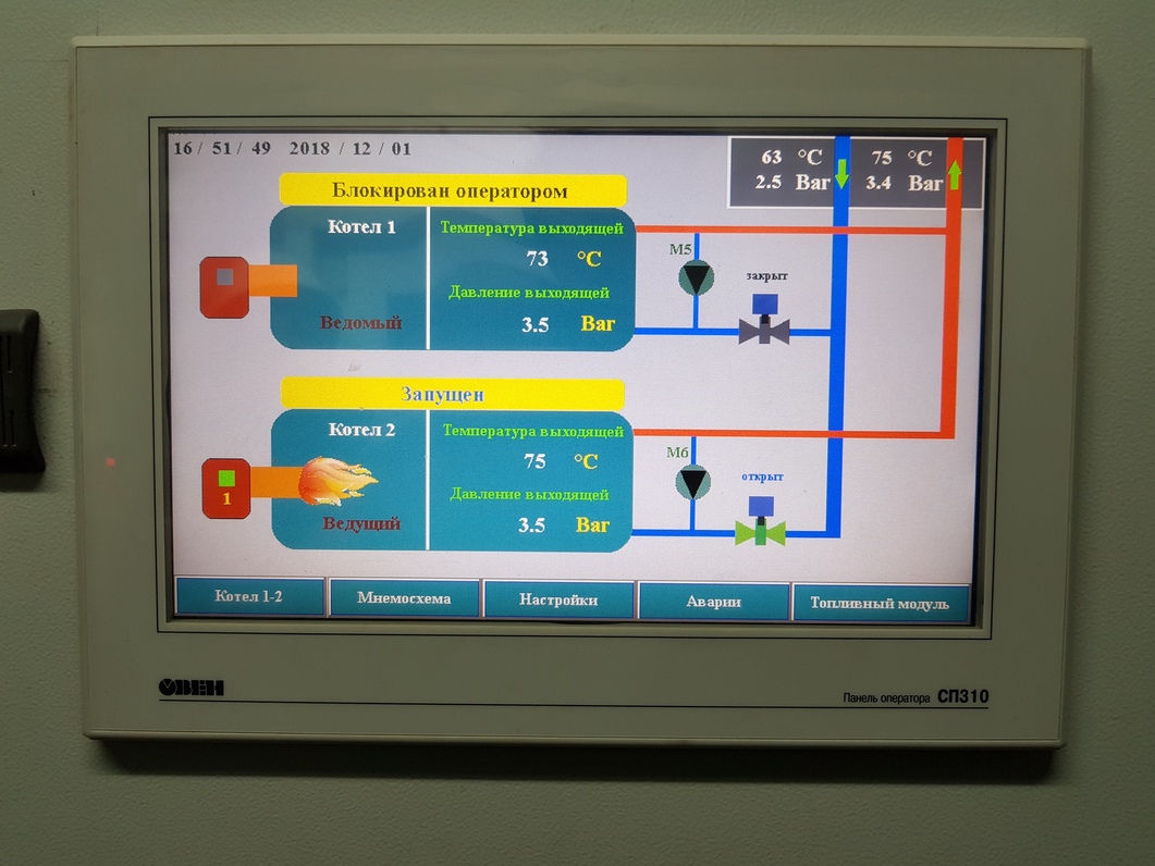 - Вывод параметров работы котельной на визуализацию (панель оператора ОВЕН СП310).
