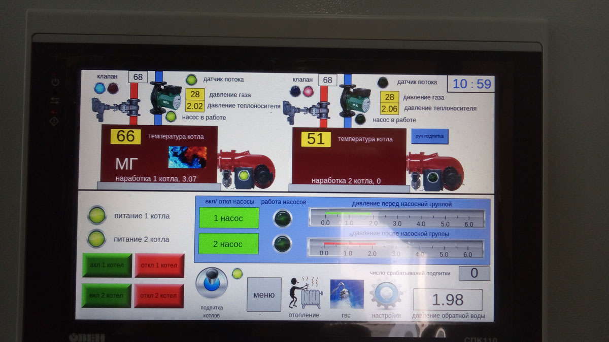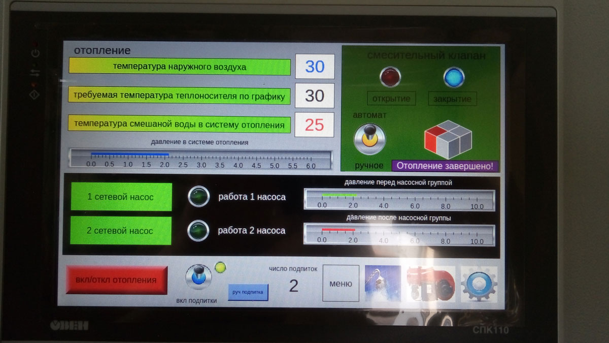 В процессе работы установки наблюдается «живая» картинка на панели контроллера ОВЕН СПК110 (имеются индикаторы измеренных значений и индикаторы состояния работы устройств и агрегатов). Для сбора сигналов с датчиков и управления исполнительными механизмами используются модули ввода/вывода ОВЕН МВ110-8А (2 шт.), МВ110-8АС (2 шт.), МУ110-16Р (2 шт.). Контроль температуры осуществляется с помощью датчиков ОВЕН ДТС035 (6 шт.), ДТС214 (6 шт.), ДТС125 (1 шт.), контроль давления — с помощью преобразователей ПД100-0,6 (13 шт.).