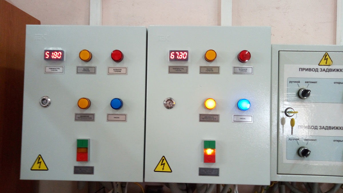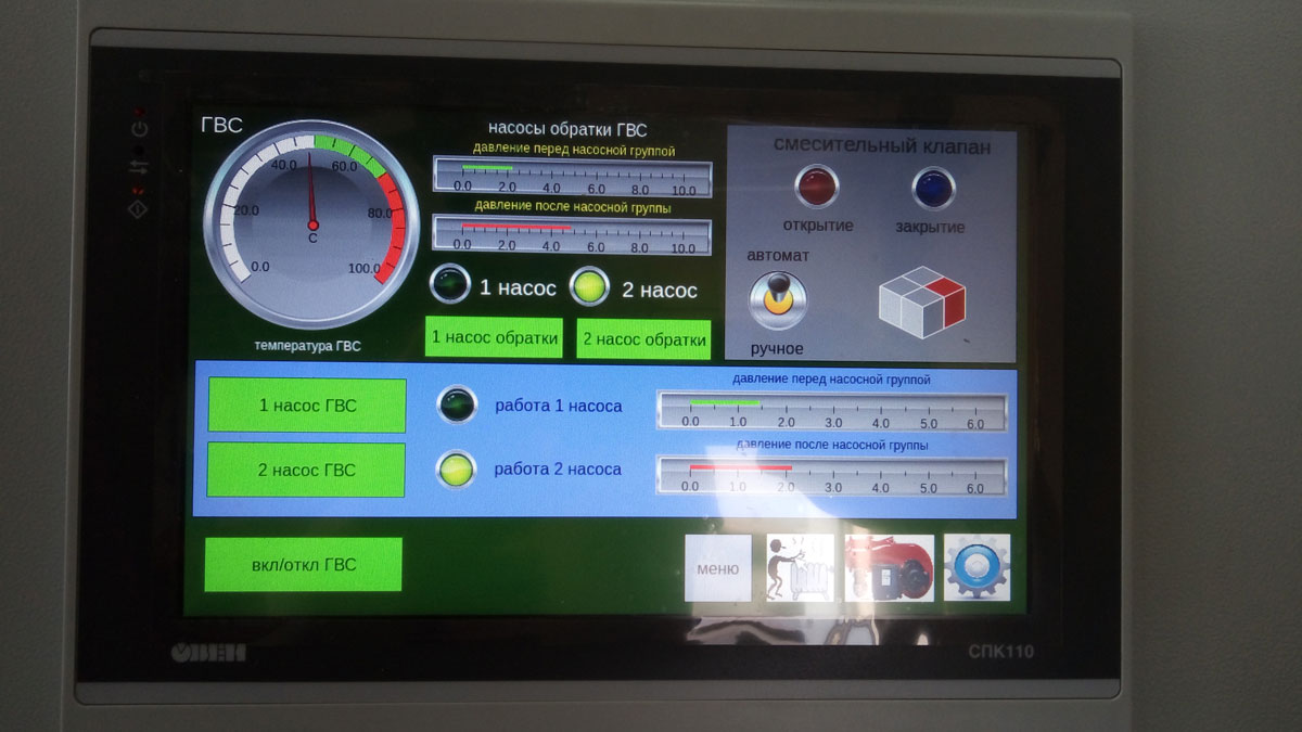 - Автоматическое управление насосными группами: котловых насосов, сетевых насосов, насосов ГВС и обратной воды ГВС. В случае выхода из строя насоса включается резервный насос. Автоматическое управление смены работы насосов по заданному таймеру с первого на второй.