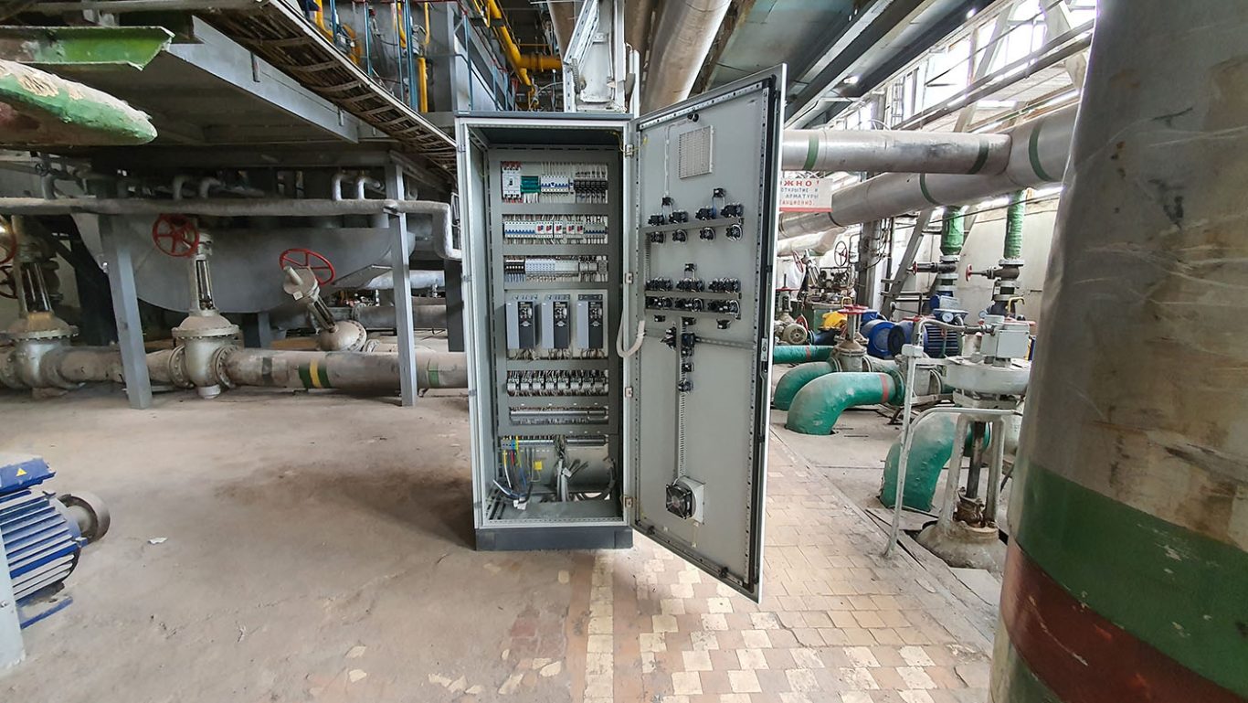 Система состоит из трех силовых шкафов, включающих в себя частотные преобразователи ОВЕН ПЧВ3. Они значительно снижают энергозатраты и нагрузку на питающий фидер, за счет снижения токов при разгоне насосных агрегатов. Преобразователи частоты плавно регулируют технологический процесс и защищают двигатели насосов от перегрузок, от обрыва фазы и имеют большой набор защитных и прочих функций. В случае неисправности преобразователя частоты система способна запускать насосы напрямую от питающей сети через магнитный пускатель. Все агрегаты снабжены защитой от «сухого хода». На силовых шкафах имеется вся необходимая сигнализация, дающая оператору исчерпывающую информацию о процессе.