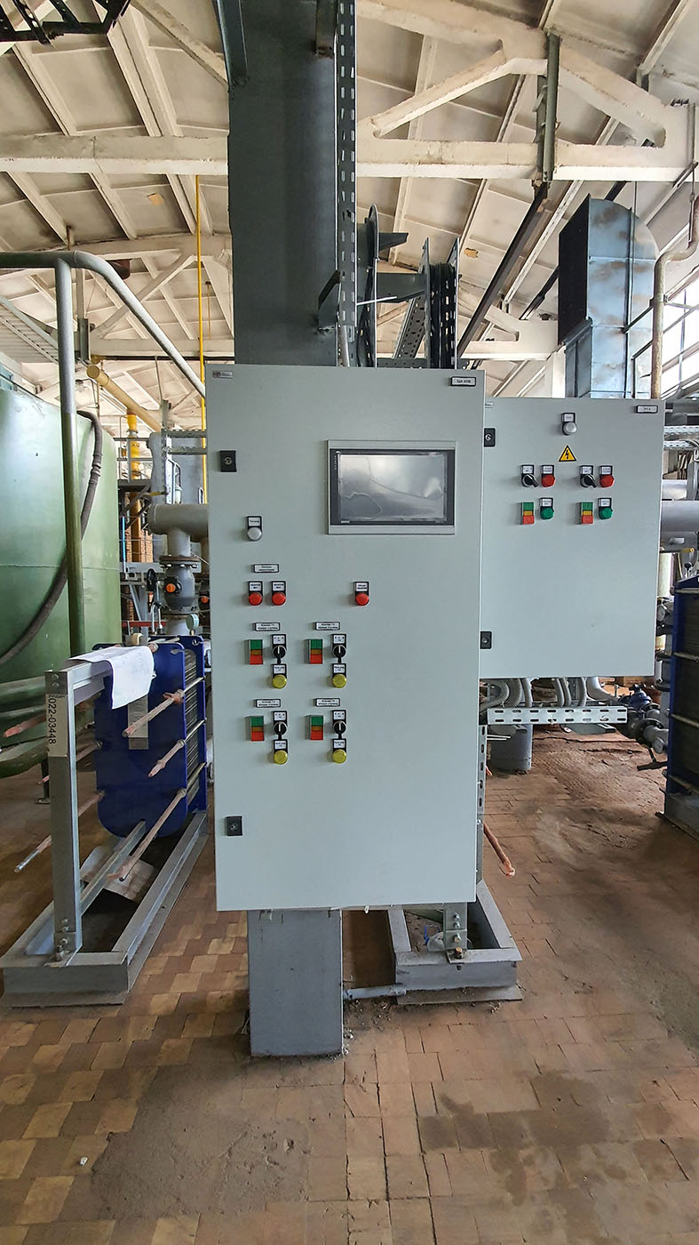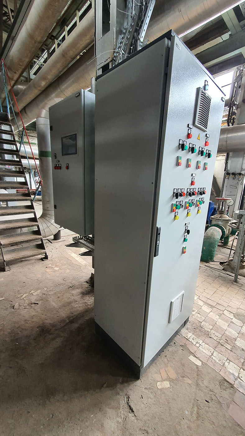 Вся информация от датчиков и агрегатов поступает на шкафы автоматизации. Система автоматизации состоит из 3 шкафов (по количеству силовых щитов). Основой шкафов являются сенсорные панельные контроллеры СПК110 с Ethernet в связке с модулями дискретного ввода/вывода и аналогово ввода/вывода: МВ110-224.8А, МВ110-224.16Д, МУ110-224.8Р и
