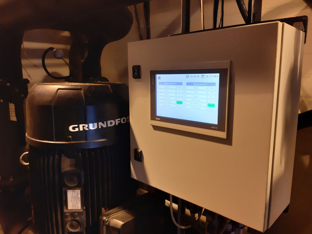 Данная насосная станция в составе теплового пункта обеспечивает перекачку теплоносителя от котельной до потребителей. Насосная станция состоит из двух насосов типа «inline» Grundfos серии ТР по 45 кВт каждый.