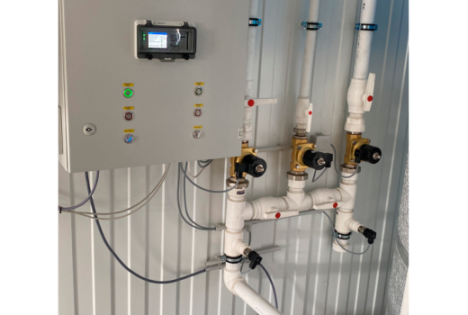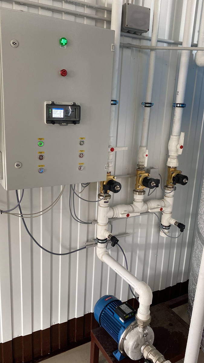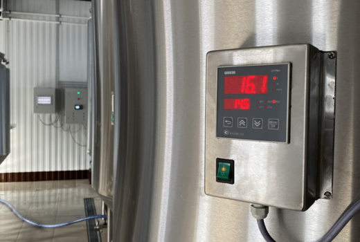 Шкаф управления цилиндроконическим танком (ЦКТ) собран на базе контроллера ОВЕН ПЛК110-30 и сенсорной панели оператора ОВЕН СП310. Управление ЦКТ реализовано через двухканальные регуляторы ОВЕН 2ТРМ1, которые установлены на каждом танке. Каждый ТРМ связан с ПЛК через RS-485. Это позволяет управлять всеми танками с панели оператора. В свою очередь ПЛК110 подключён к облачному сервису OwenCloud, где также реализовано управление, синхронизированное с панелью оператора СП310. Такая экосистема легко позволяет отправлять в облако температуру, давление и уровень гликоля в баке. Запустить или изменить уставку можно из любой точки мира.