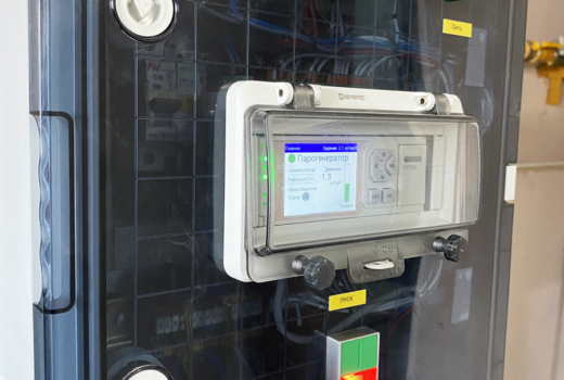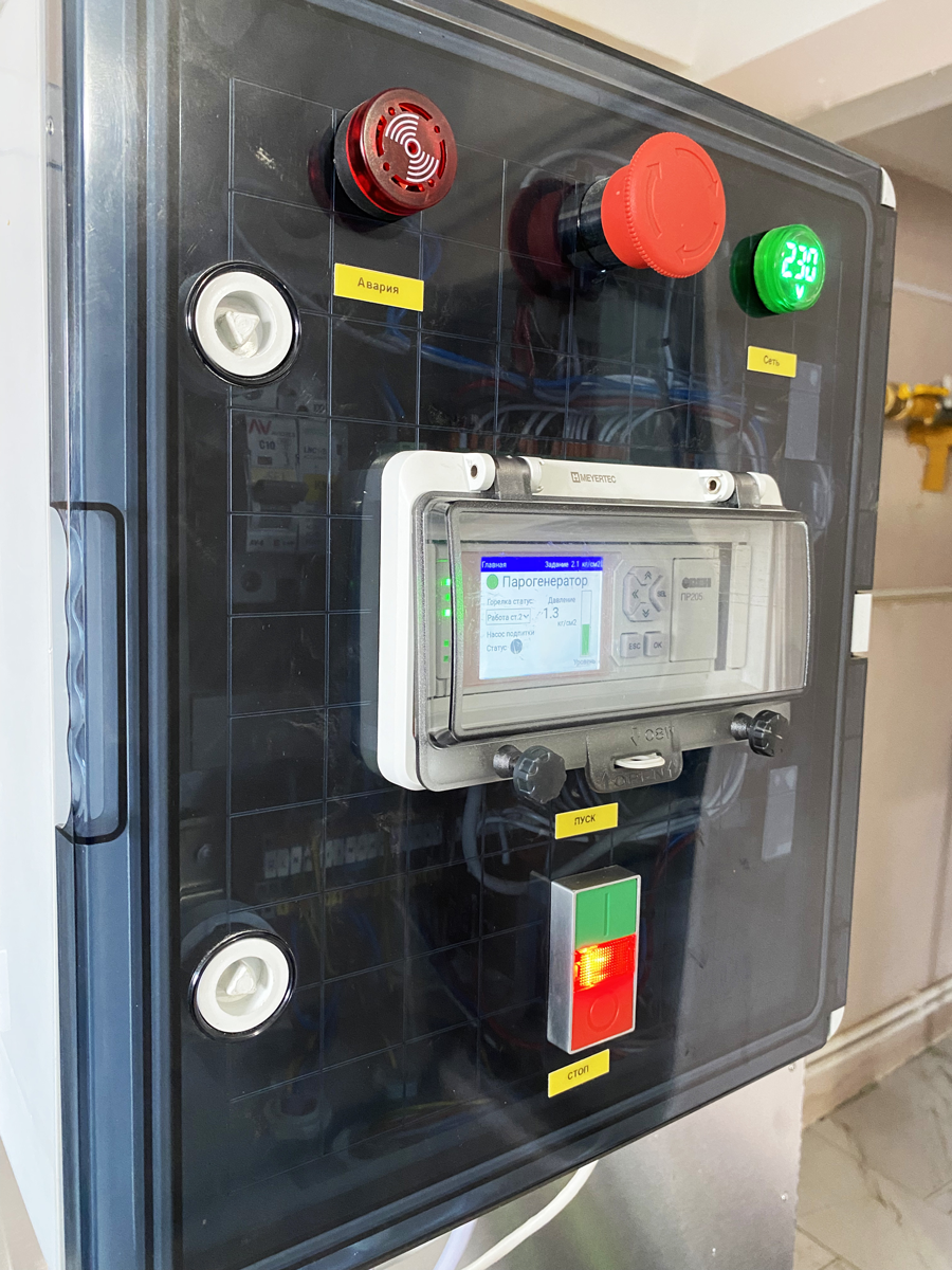 Шкаф парогенератора собран на базе программируемого реле ОВЕН ПР205, которое через Ethernet связано со шкафом варочного порядка, что позволяет управлять парогенератором не только со стационарного щита, но и с сенсорной панели управления варочного порядка. Управление синхронизировано, то есть можно включить парогенератор со щита, а выключить с панели оператора и наоборот. Уставка по давлению работает по такому же принципу. Также на панель оператора транслируются текущие параметры парогенератора (давление, уровень, состояние горелочного устройства, аварии), что позволяет всегда видеть текущую ситуацию, и в случае необходимости иметь возможность ее скорректировать.