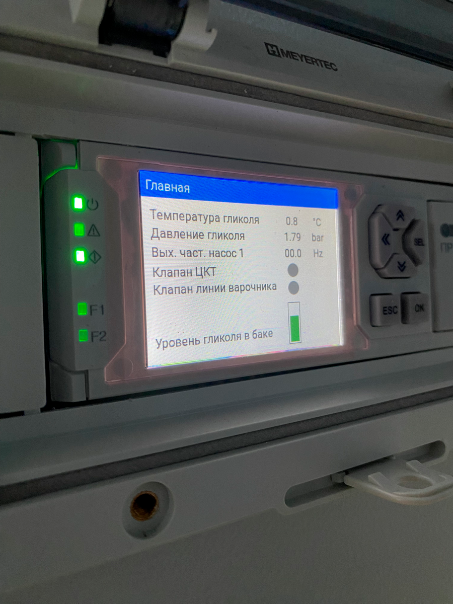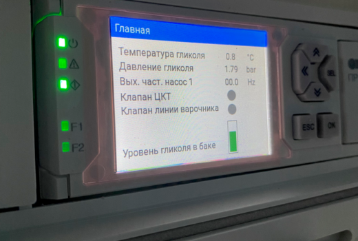 Шкаф насосов гликоля также собран на базе программируемого реле ОВЕН ПР205, который контролирует подачу гликоля с заданной температурой и давлением в магистраль варочного порядка (охлаждение бака с ледяной водой и подача гликоля на теплообменник при процессе перекачки сусла) и магистраль охлаждения цилиндроконического танка (ЦКТ). Данный шкаф также связан по Ethernet со шкафом варочного порядка и по RS-485 со шкафом ЦКТ и работает по принципу «запроса на охлаждение». Если от варочного порядка или шкафа ЦКТ поступает такой запрос, то открывается соответствующий клапан на магистрали, и включается насос.