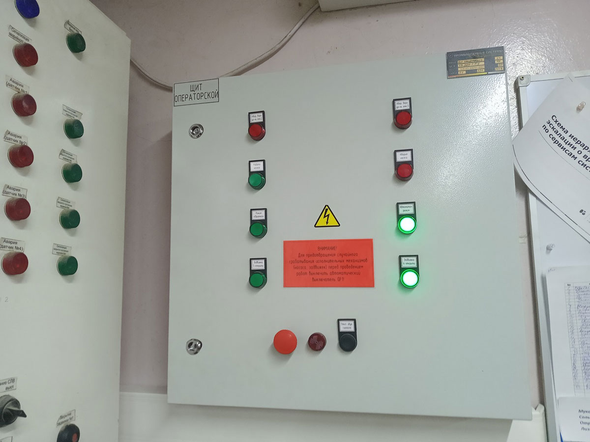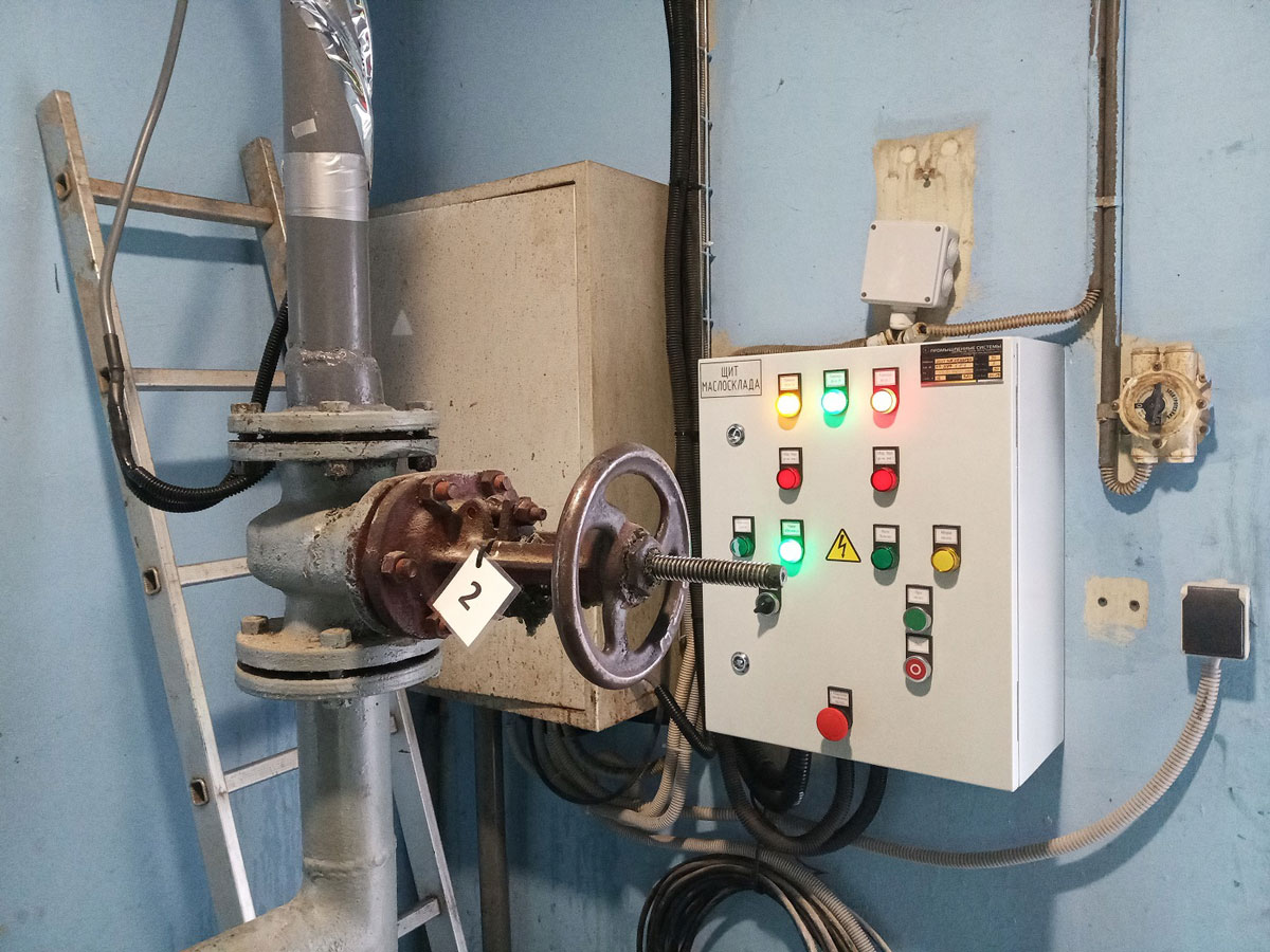Прием масла с автоцистерны в емкость-аккумулятор объемом 250 т осуществляется в ручном режиме с помощью кнопок управления насосом, установленных на двери щита маслосклада. Также на двери имеются переключатели и световые индикаторы работы оборудования и аварийных ситуаций.