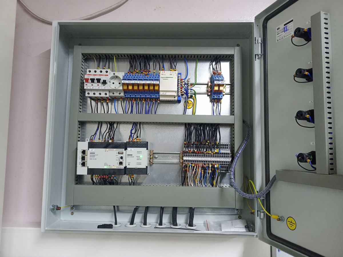 Автоматический режим работы осуществляется с помощью программы, загруженной в контроллер ОВЕН ПЛК110, который установлен в щите операторской. В соответствии с сигналами от ультразвуковых уровнемеров поддерживается рабочий уровень масла в оперативных емкостях путем управления насосом и пневматическими задвижками на входах емкостей. Для защиты от перелива в емкостях также установлены вибрационные сигнализаторы аварийного верхнего уровня.