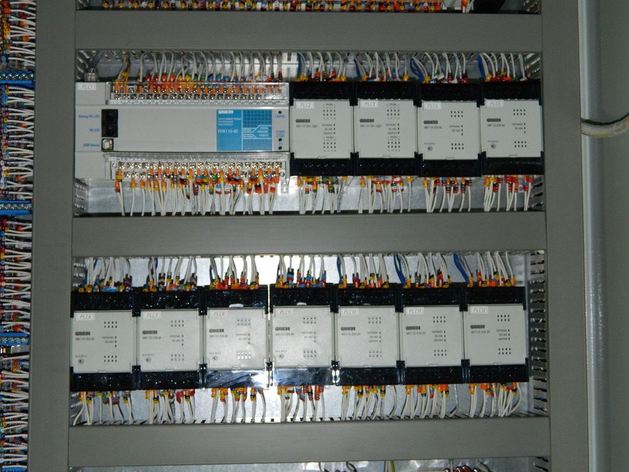 Для контроля и управления оборудованием используется контроллеры ОВЕН ПЛК110. К ним подключены модули ввода/вывода ОВЕН МВ110-224.16ДН, МВ110-224.8А, МУ110-224.6У, а также сенсорные панели оператора.
