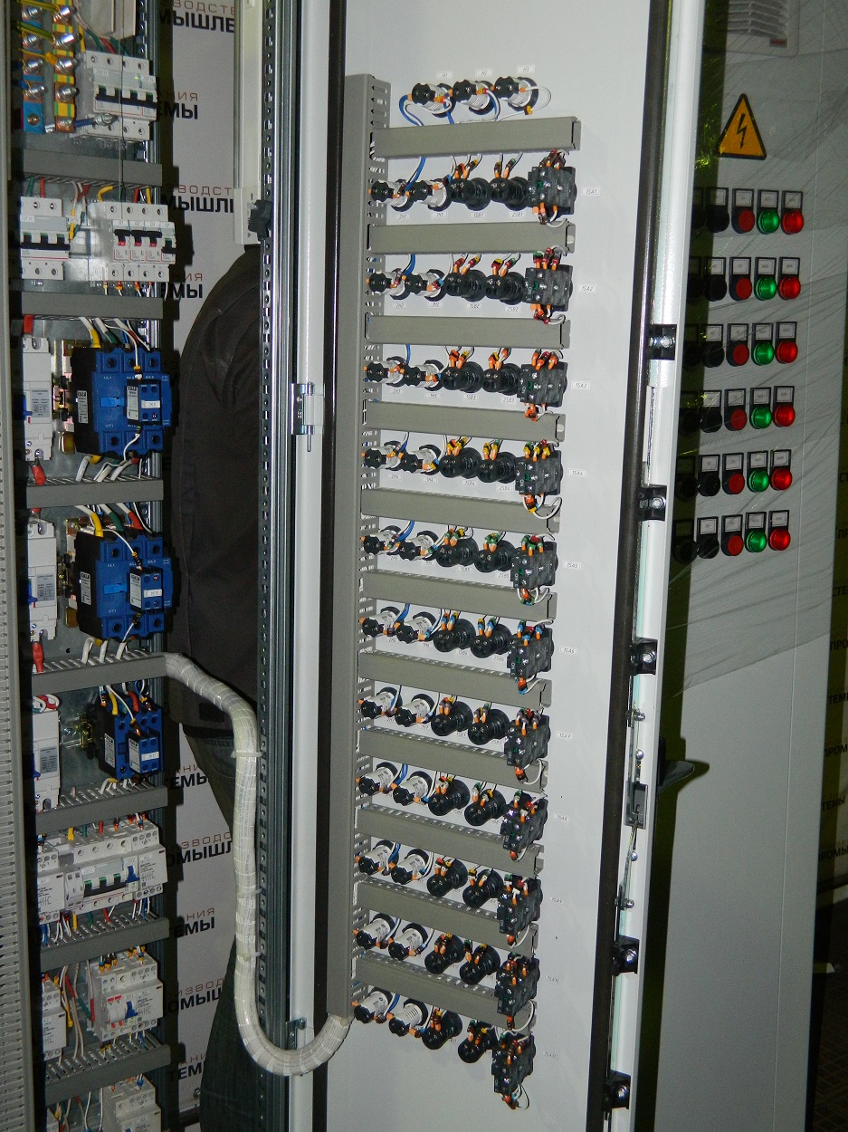 В рамках поставки электрощитового оборудования были поставлены силовые шкафы и шкафы управления для двух корпусов (ИТП). Для приема и распределения электроэнергии в тепловых пунктах используются вводно-распределительные устройства, состоящие из пяти панелей каждое (всего 10 панелей). В вводных панелях установлены переключающие рубильники, ограничители перенапряжения, амперметры и вольтметры. Панели АВР в ИТП1 и ИТП2 реализованы на базе блоков автоматического ввода резерва. В распределительных панелях ВРУ установлены аппараты защиты и коммутации (контакторы, устройства плавного пуска, кнопки и лампы) технологического оборудования тепловых пунктов. Все автоматические выключатели снабжены контактами состояния, сигнализирующими об аварийном отключении. Эта информация передается на контроллеры, установленные в шкафах автоматики.