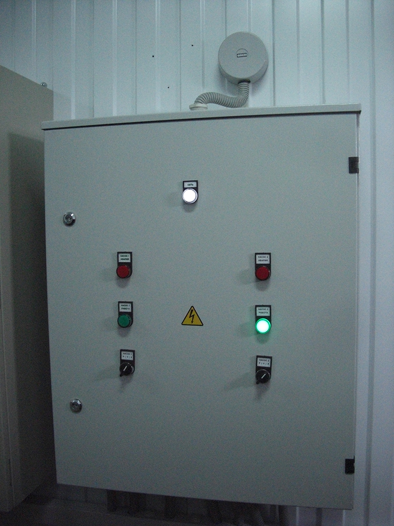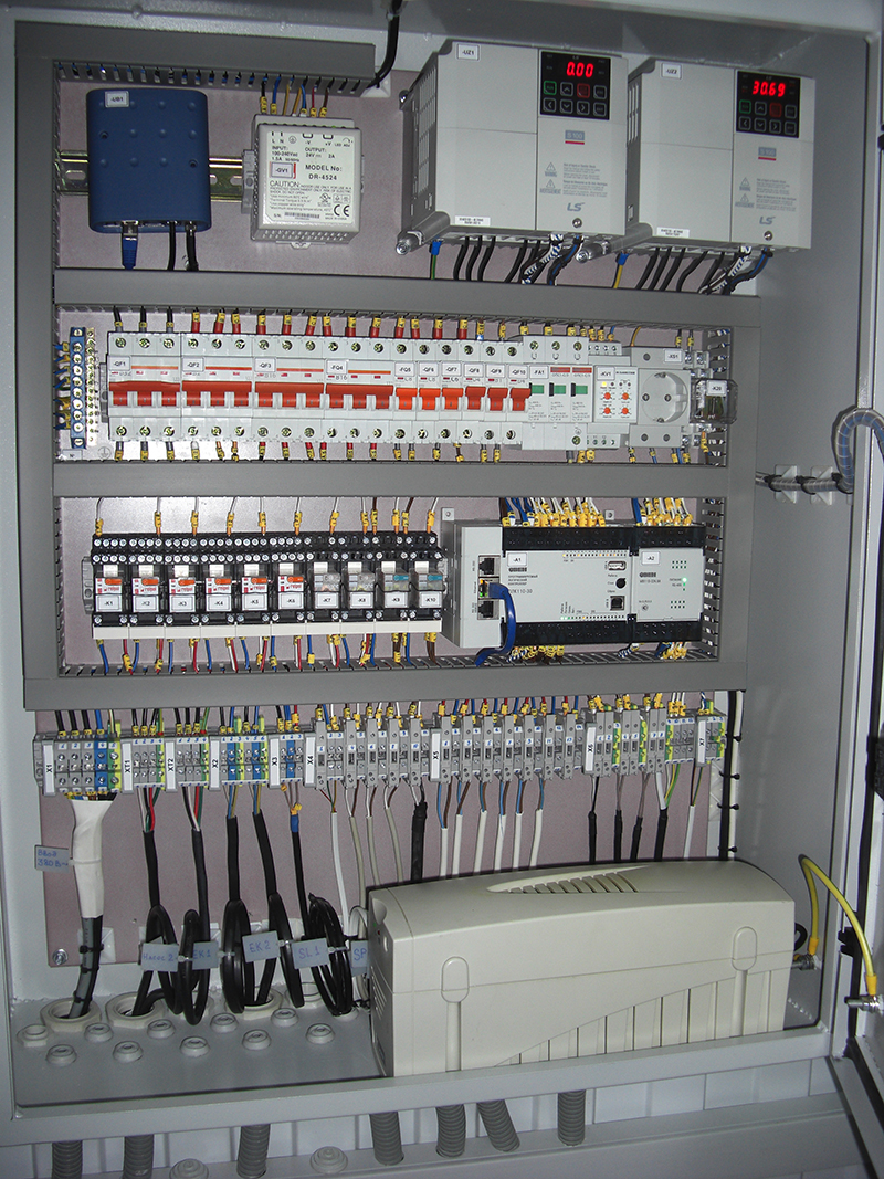 Питание электрооборудования системы управления осуществляется от трехфазной сети переменного тока напряжением 380 В ± 10 % и частотой 50 Гц ± 1 % (3 фазы N+PE). Номинальный ток вводного выключателя Iн.= 32 А. Общее управление системой осуществляется программируемым контроллером ПЛК110 компании ОВЕН. В системе управления также применяются: