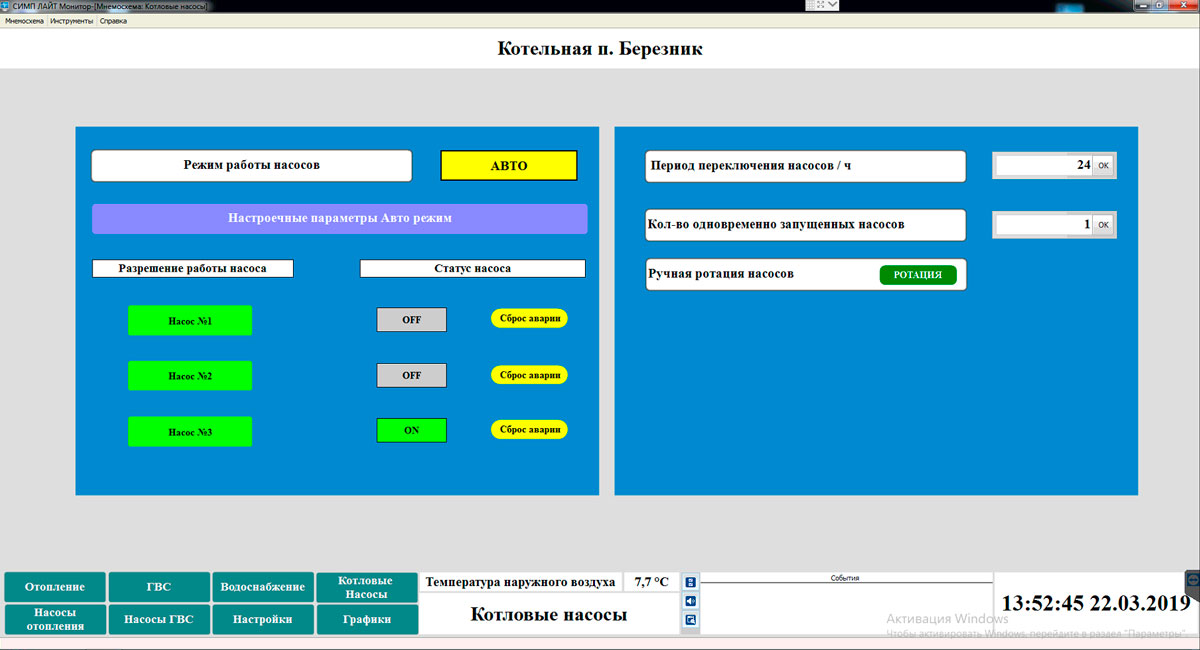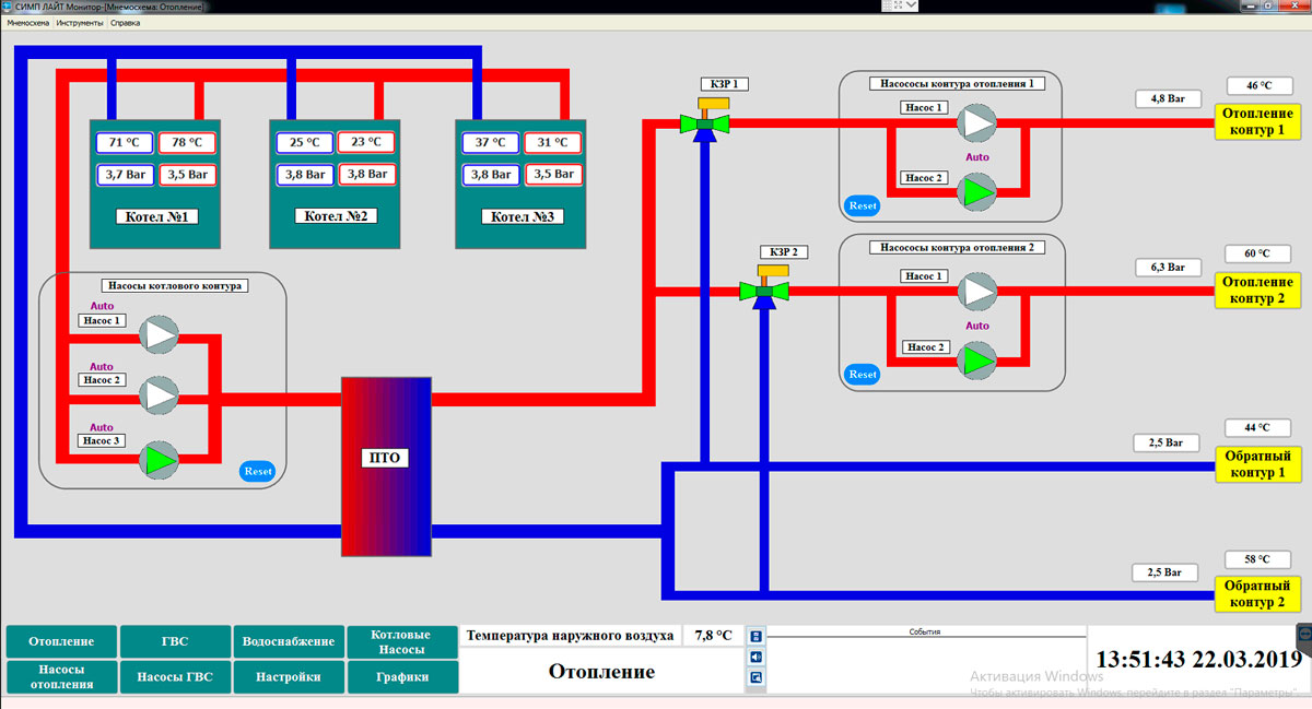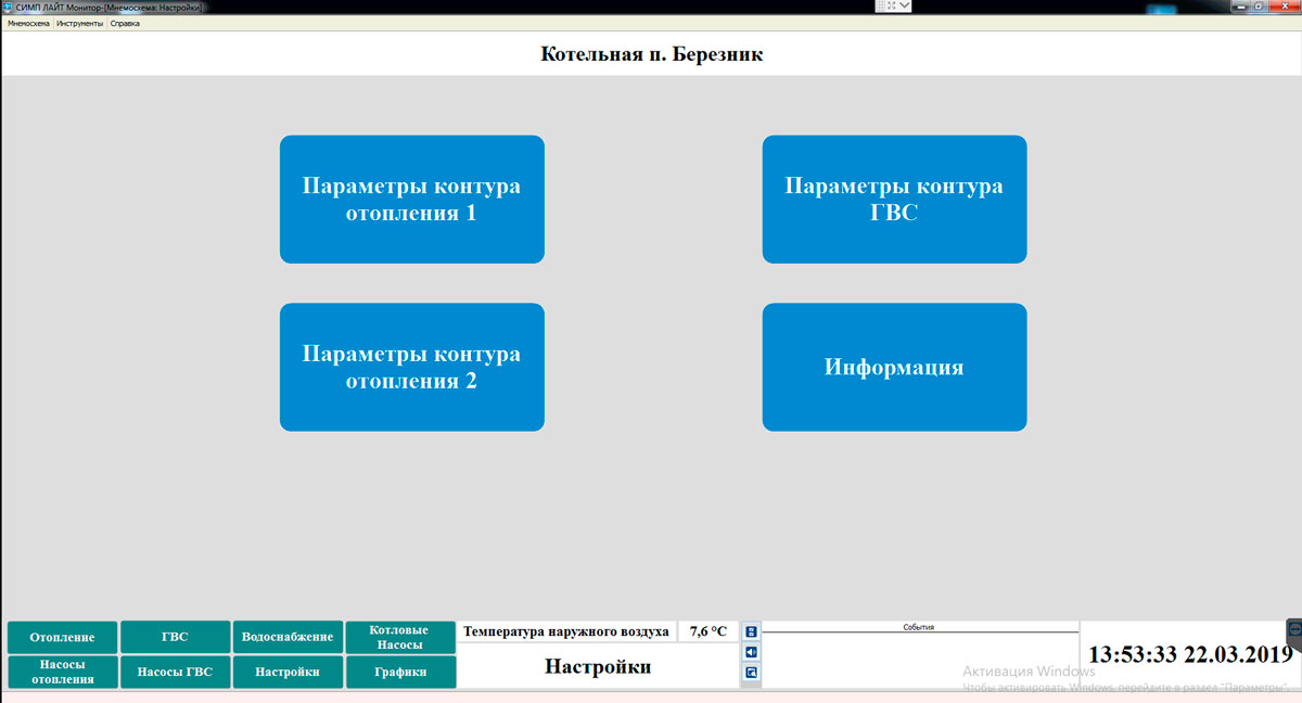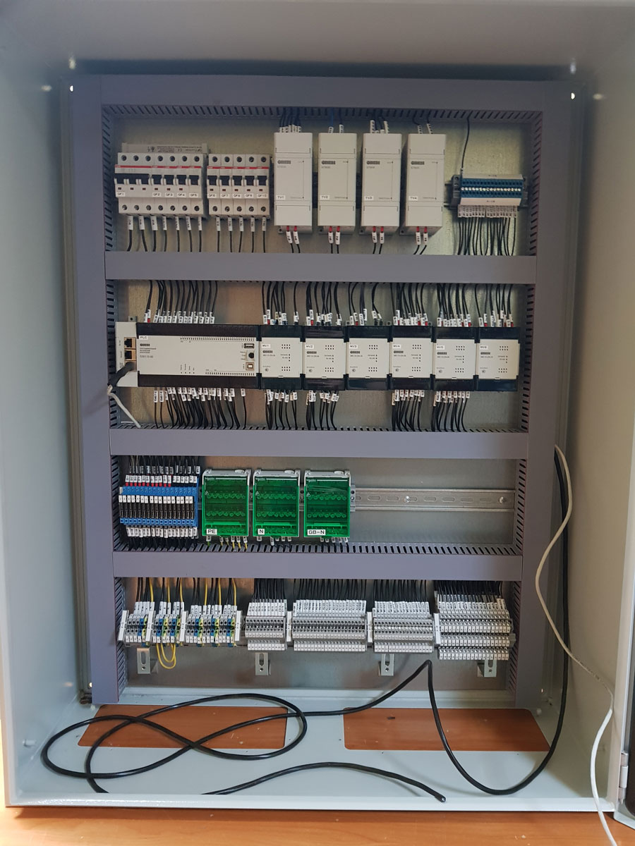 На котельной уже была смонтирована вся силовая часть (устройства пуска, частотные преобразователи, контакторы и т.п.) управления тепловым пунктом котельной. Задача нашей компании заключалась в разработке системы автоматического управления тепловым пунктом и интеграции ее с действующей коммутационной аппаратурой.