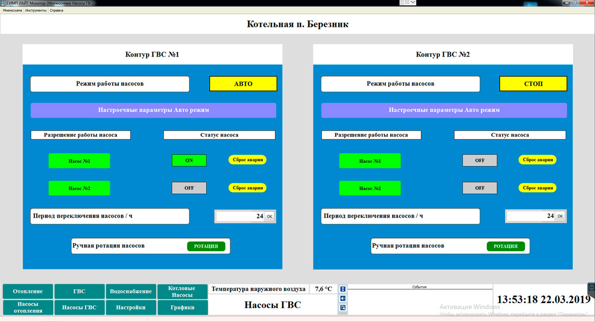 - 2 насосных группы контуров ГВС (по 2 насоса).