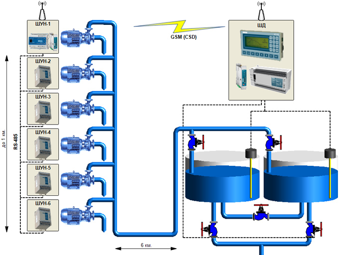 Система автоматизации состоит из шкафов управления насосами ШУН-1 (главный) и ШУН-2…ШУН-6 (подчиненные), а также диспетчерского шкафа ШД, управляющего работой всех остальных шкафов. Схема системы удаленного управления насосами представлена на рис. 1.