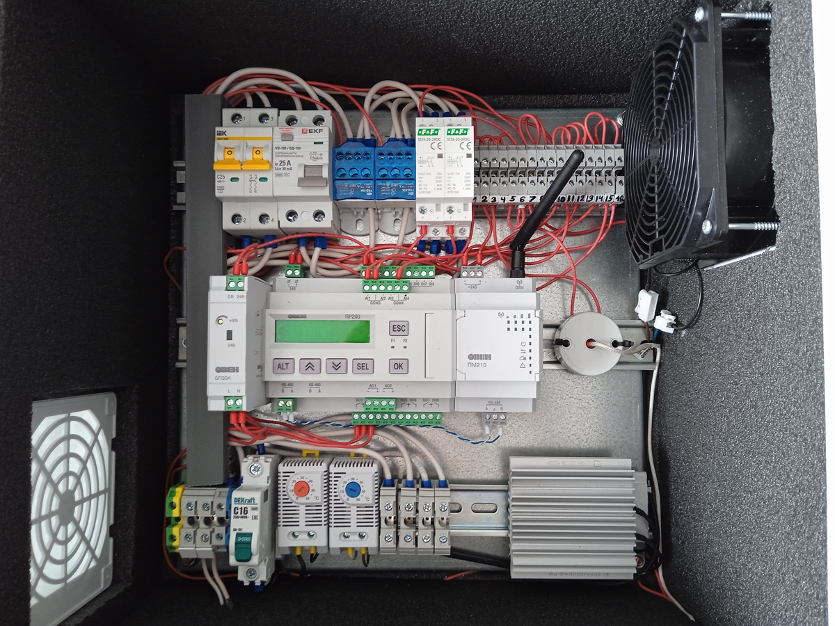 Перед партнером стояла задача разработать шкаф управления системами обогрева и вентиляции помещения с функциями контроля предельно-допустимой концентрации (ПДК) выхлопных газов, температуры и влажности. Оборудование должно контролировать и поддерживать заданные параметры температуры помещения по выбранной пользователем уставке.