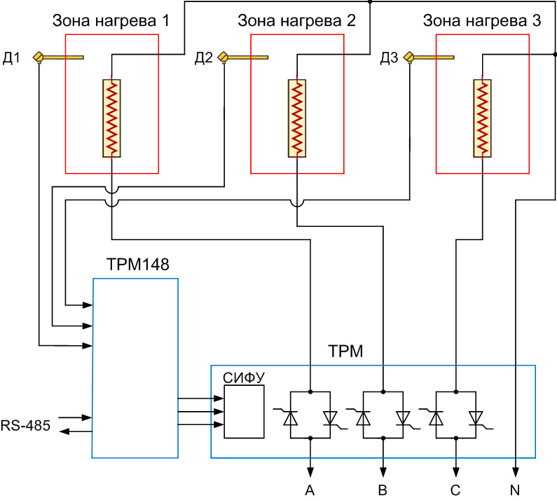 Интересным примером может послужить система управления многозонным обогревом инфракрасными обогревателями, популярность которых растет с каждым годом. Для этого применен многоканальный ПИД-регулятор ТРМ148. Обогреватели соединены по схеме «звезда» с общим нулевым проводом, благодаря чему создаются три независимых контура регулирования. В каждой зоне установлен свой датчик: Д1, Д2, Д3, в зависимости от их показаний ПИД-регулятор корректирует управляющие сигналы 0..10 В для тиристорного регулятора, который регулирует мощность раздельно в каждом из нагревательных элементов.