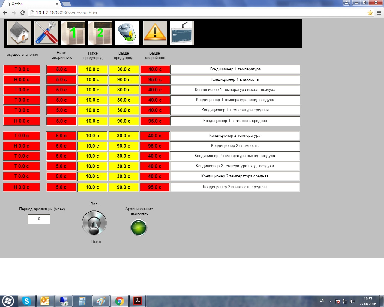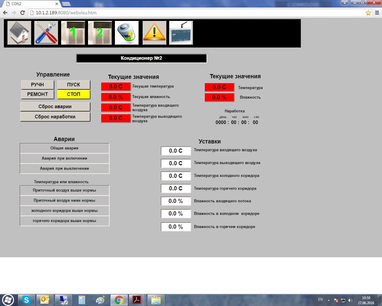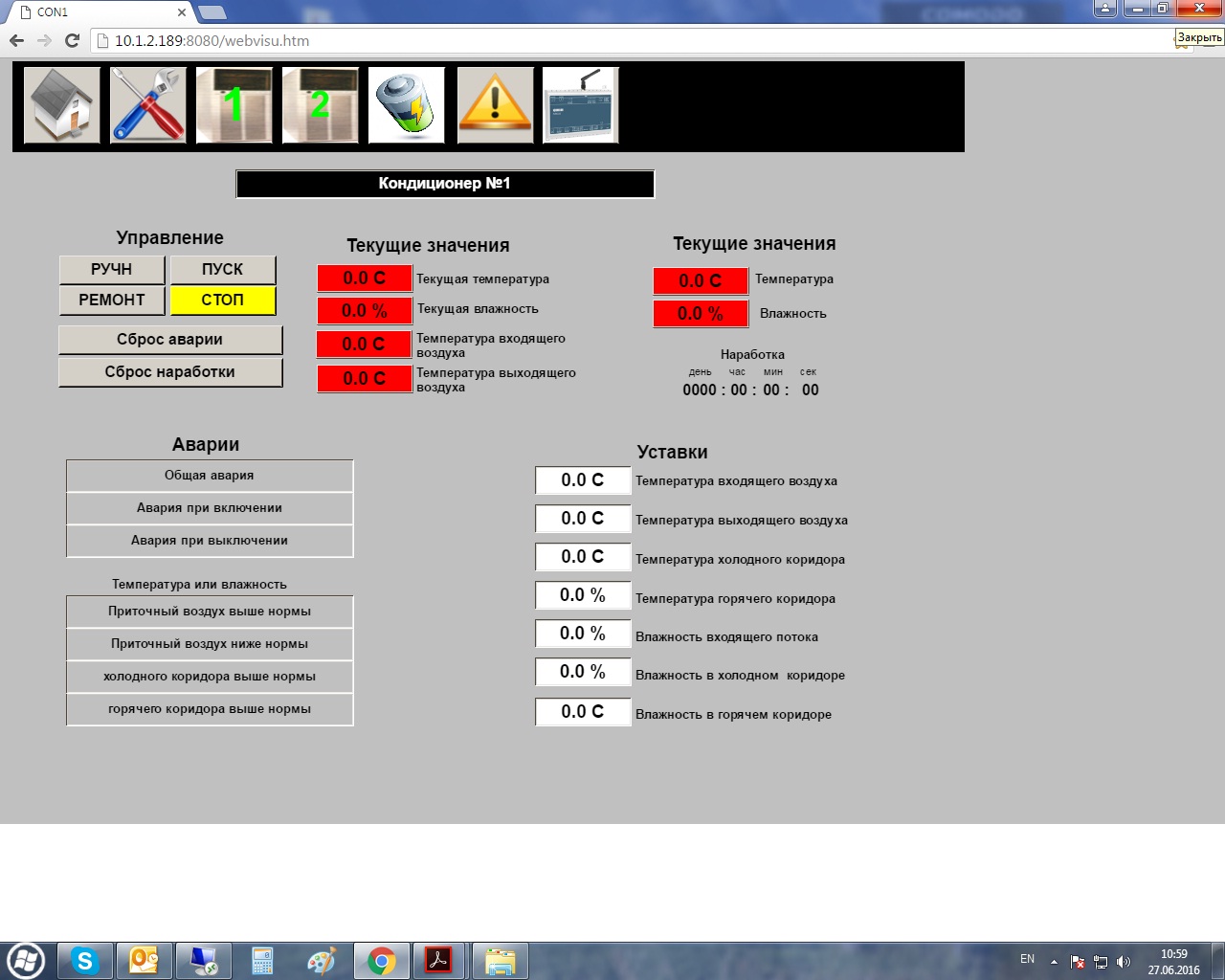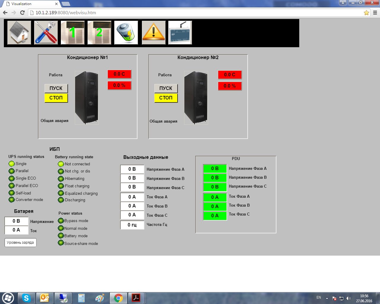 Управление системой осуществляется через экраны: Главный экран, Экран подсистемы диспетчеризации кондиционеров, Экран подсистемы диспетчеризации оборудования энергоснабжения (ИБП), Экран модулей ввода/вывода, Журнал аварий и событий. АРМ диспетчера обеспечивает получение из базы данных реального времени любую историческую и текущую информацию по всем контролируемым параметрам автоматизированного объекта через WEB-браузер контроллера.