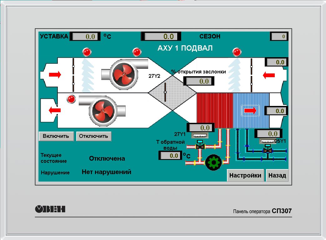 Старое оборудование Siemens Desigo заменили на оборудование компании ОВЕН. Оперативно был осуществлен монтаж и пусконаладочные работы. Для двух контроллеров ОВЕН ПЛК110 и двух сенсорных панелей оператора ОВЕНН СП307-Б было разработано прикладное программное обеспечение. На базе WEB и OwenCloud — SCADA на сайте компании организован удаленный контроль и мониторинг параметров работы оборудования.