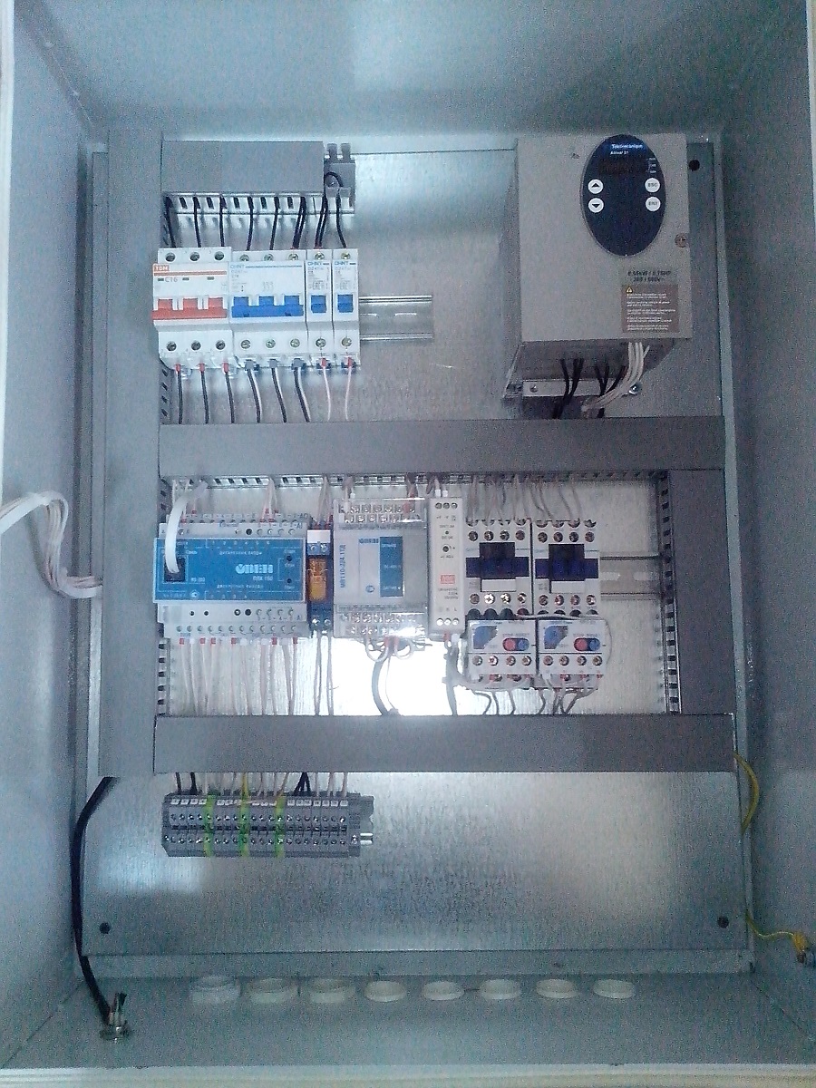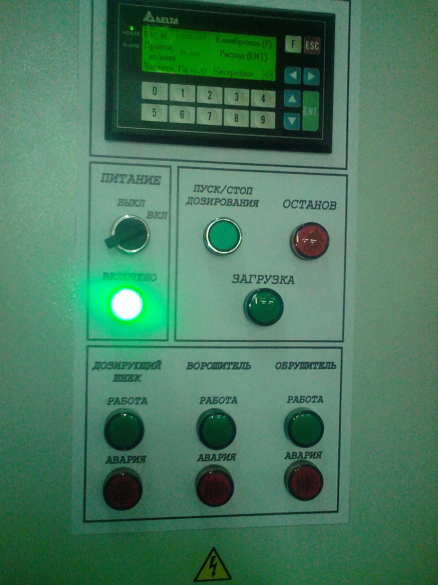 Разработан шкаф управления дозатором непрерывного действия. Система управления состоит из программируемого контроллера ОВЕН ПЛК150, модуля ввода сигнала тензодатчика ОВЕН МВ110-1ТД, панели оператора, преобразователя частоты и силовой аппаратуры.