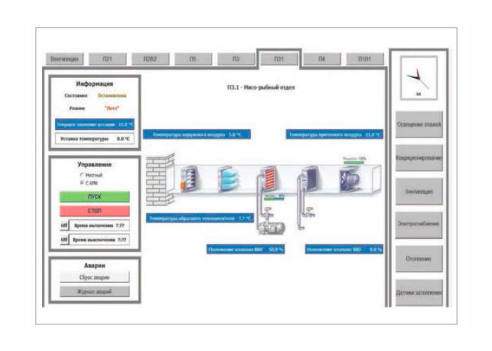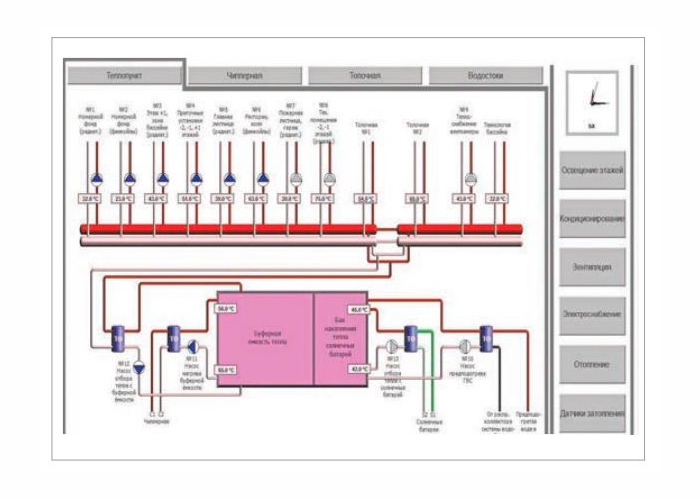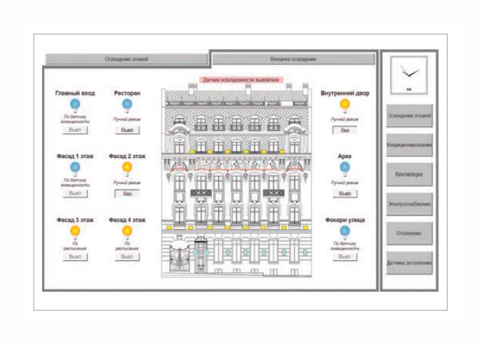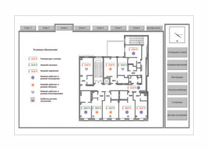 Информация о состоянии всех систем распределяется на ресепшен, рабочие места диспетчера технической службы и главного инженера и выводится в виде визуально понятных символов в соответствующих окнах SCADA-системы.
