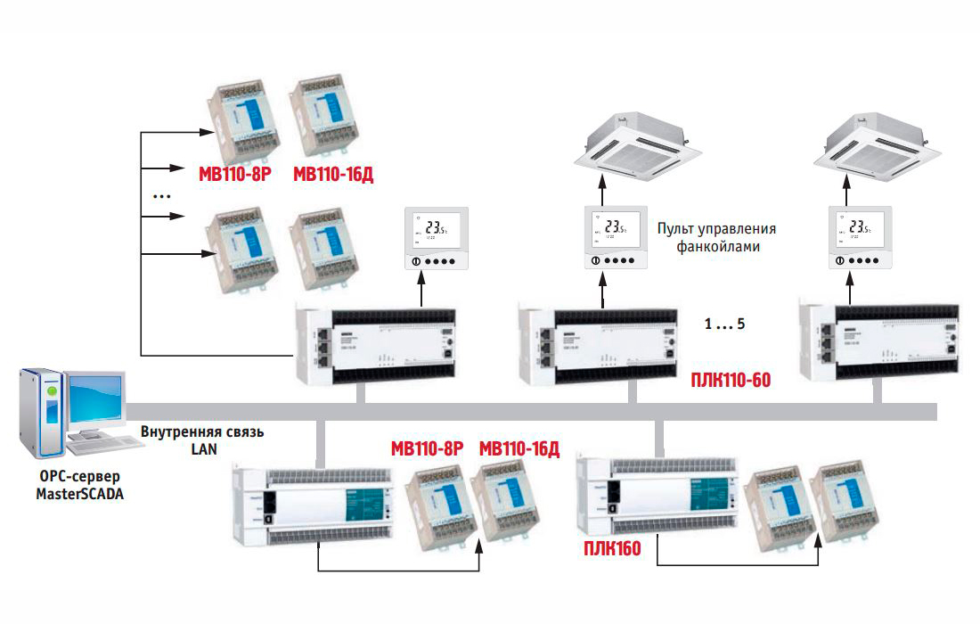- модули ввода/вывода: МВ110-8А (4 шт.), МВ110-16Д (6 шт.), МВ110-8Р (6 шт.);