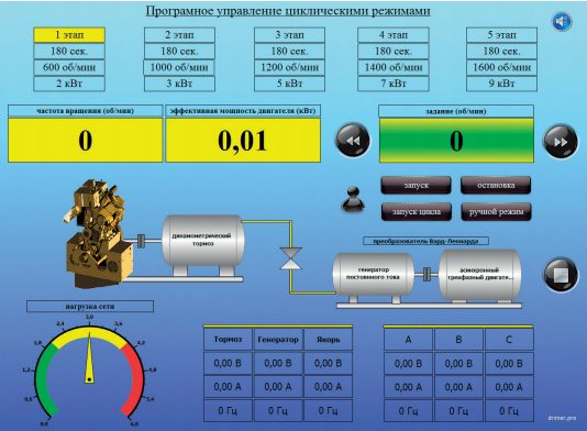 - разработана новая система для управления динамометрическим тормозом и мотор-генератором на базе тиристорных преобразователей для управления скоростью и моментом вращения на базе DVP-SV с цепями защиты и управления;