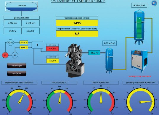 АСУ стендом разработана на базе программного обеспечения Simp-Light с поддержкой Modbus, которое обеспечивает измерение, визуализацию, индикацию и архивирование всех технологических параметров. Новый компьютеризированный пульт состоит из встроенного промышленного компьютера, ручных органов управления, тахометра и девяти регуляторов, на которых отображаются температура, давление и обороты двигателя. Сбор данных с контрольно- измерительных приборов и ПЛК осуществляется по протоколу Modbus. Программное обеспечение Simp-Light позволяет представлять автоматически сформированные протоколы испытаний в графическом виде или в открытом формате (.odf) согласно ГОСТ Р ИСО/МЭК 26300-2010.