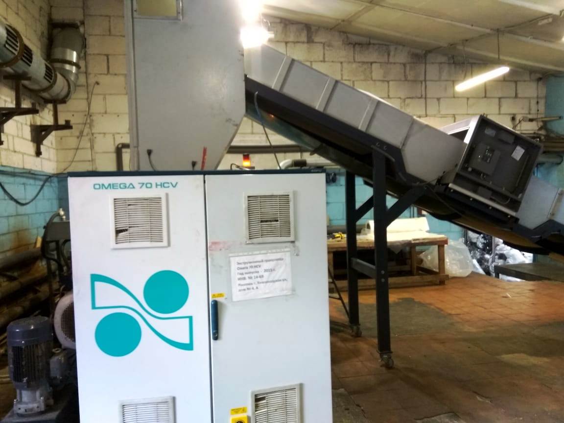 Линия грануляции полиэтилена состоитизтранспортера для подачи пленки в бункер, шредера для его измельчения, двух шнеков, шестинагревателей, фильера, режущихножейи системы вакууммирования и охлаждения.