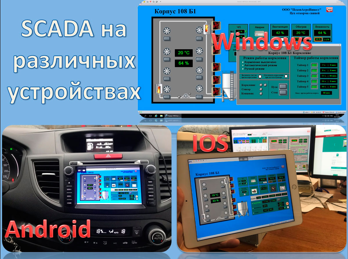 Управление всеми процессами ведется через SCADA-систему, с разделением прав доступа для зоотехнического персонала (для корректировки микроклимата и режима кормления), для технического персонала (ТО и аварийные ситуации) и режим просмотра без возможности внесения изменений (для руководителей). SCADA работает на всех устройствах с поддержкой RDP.