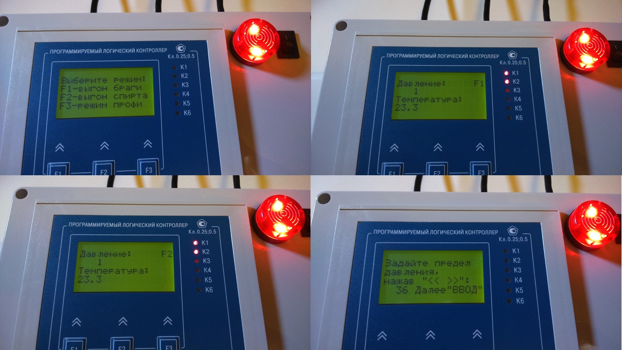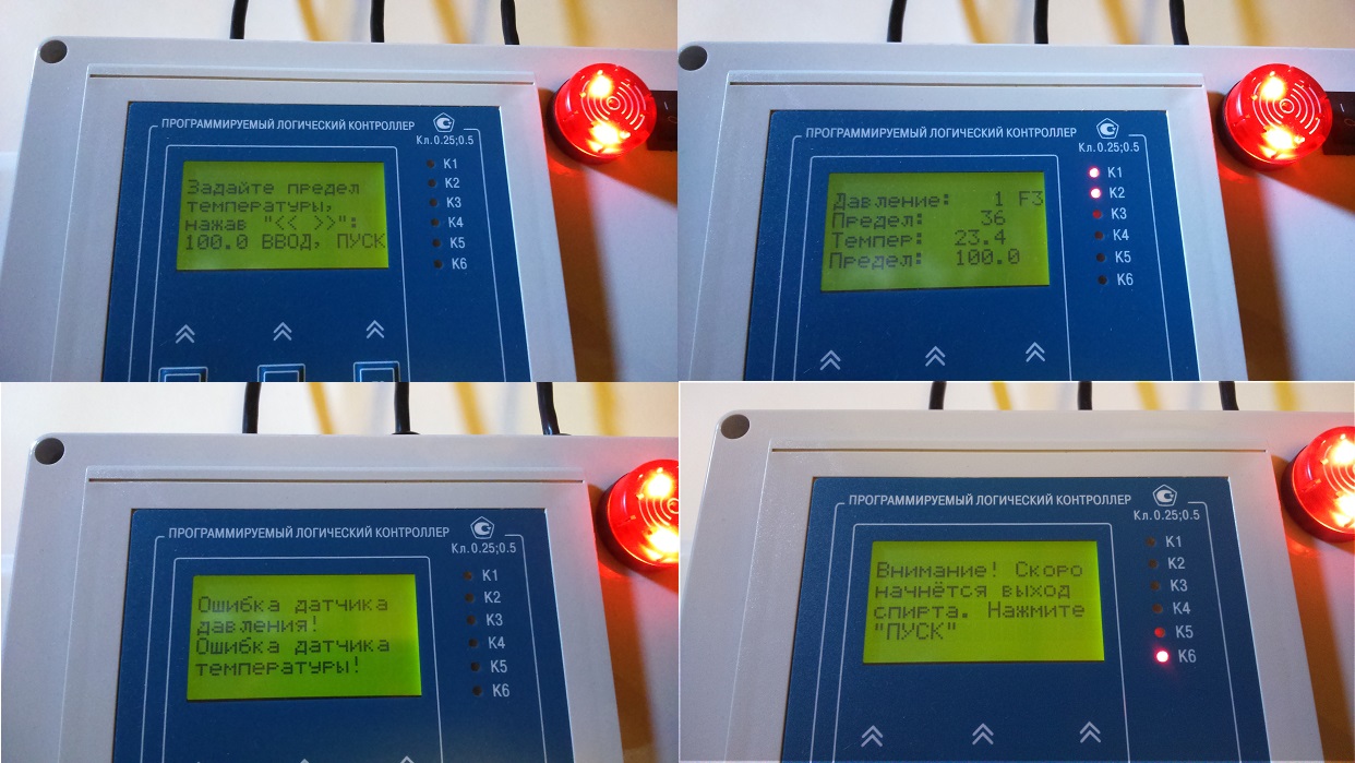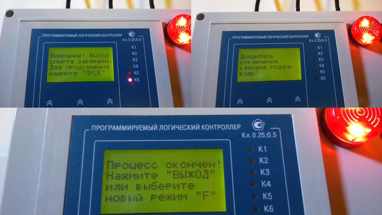 Клапан подачи воды охлаждения открывается автоматически при достижении необходимой температуры в перегонном кубе. Вся информация отображается на экране контроллера ОВЕН ПЛК73 на русском языке с большим количеством подсказок. Модуль управления имеет несколько режимов защиты и оповещения, что позволяет исключить возможные ошибки в процессе эксплуатации, а также своевременно контролировать операции или неисправности в процессе ректификации: