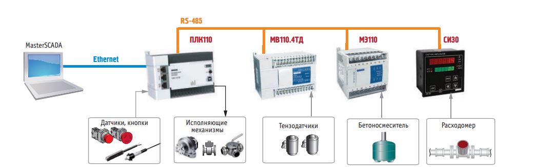 Главным элементом управляющей системы стал программируемый логический контроллер ОВЕН ПЛК110 с развитыми коммуникационными возможностями и удобной средой программирования CODESYS. Программа контроллера написана на языке ST. Связь с контроллером осуществляется по интерфейсу Ethernet (10/100 Mbit). Счетчики импульсов ОВЕН СИ30 фиксируют расход воды и присадок. Модуль ввода параметров электрической сети ОВЕН МЭ110-220.3М контролирует нагрузку на двигатель бетоносмесителя. Тензодатчики, используемые на весоизмерительном бункере и на ленте транспортера, подключены к модулю ввода сигналов тензодатчиков МВ110-224.4ТД. На рис. 1 показана функциональная схема управления бетоносмесительным комплексом. За процессом загрузки следит видеокамера и передает данные на ПК. SCADA-система с интуитивно понятным интерфейсом и цветовой индикацией отображает работу бетоносмесительного узла в реальном времени. На мнемосхемах подробно отображается технологический процесс.