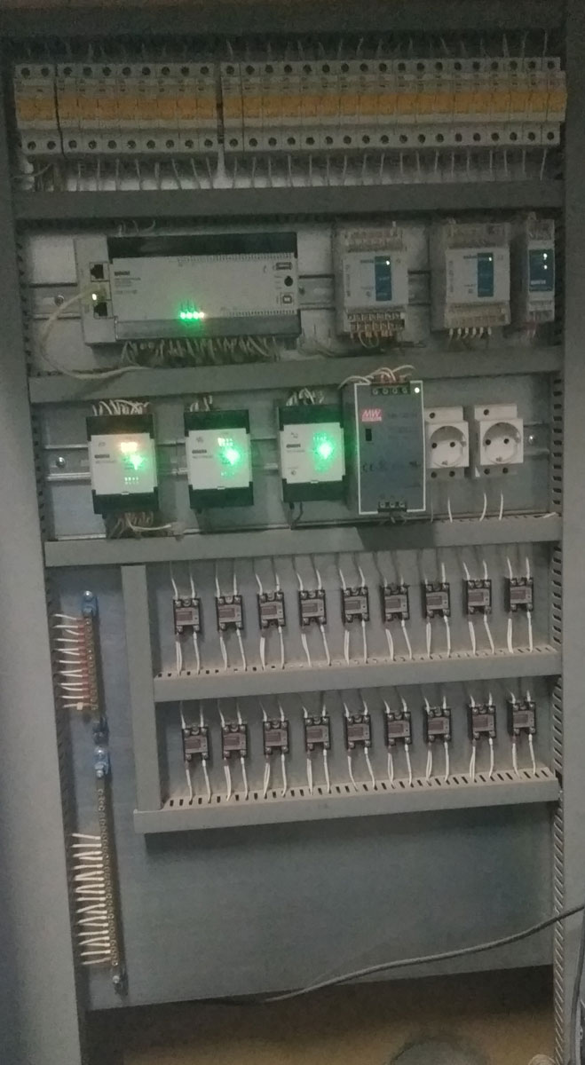 - Для смесительного узла был спроектирован и собран шкаф автоматики на основе ОВЕН ПЛК110-60 в качестве основного контролера, а для расширения каналов ввода/вывода были использованы такие модули как ОВЕН МВ110-8А (2 шт.), МВ110-4ТД (1 шт.), МВ110-8ДФ (1 шт.), МВ110-224-IT (1 шт.), МУ110-8Р(1 шт.). Данный шкаф управления позволил более оперативно управлять таким важным процессом как создание смеси компонентов для формовки блоков, проверять соответствие рецептам производства и снизить общие трудозатраты, а также обеспечить безостановочное производство и диспетчеризацию путем вывода всей информации на SCADA-систему.