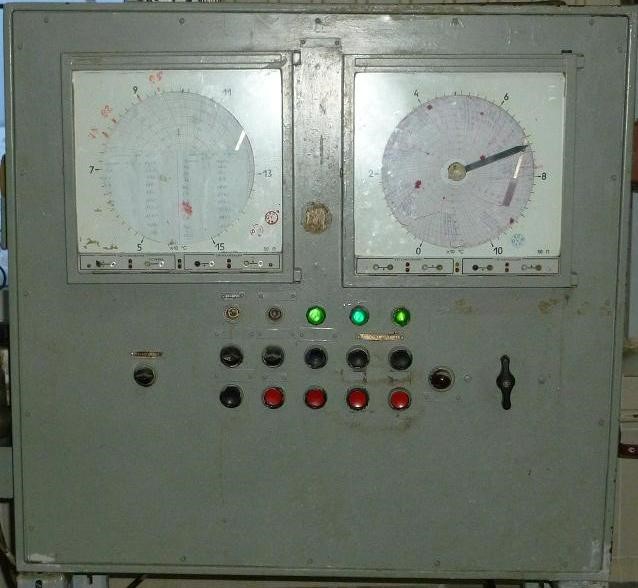 Система управления установкой ОПК-5 в ее исходном варианте строилась на использовании в качестве регулирующих и регистрирующих приборов КСП-3. Фотография шкафа управления ОПК-5 в исходном варианте представлена на рис. 1.