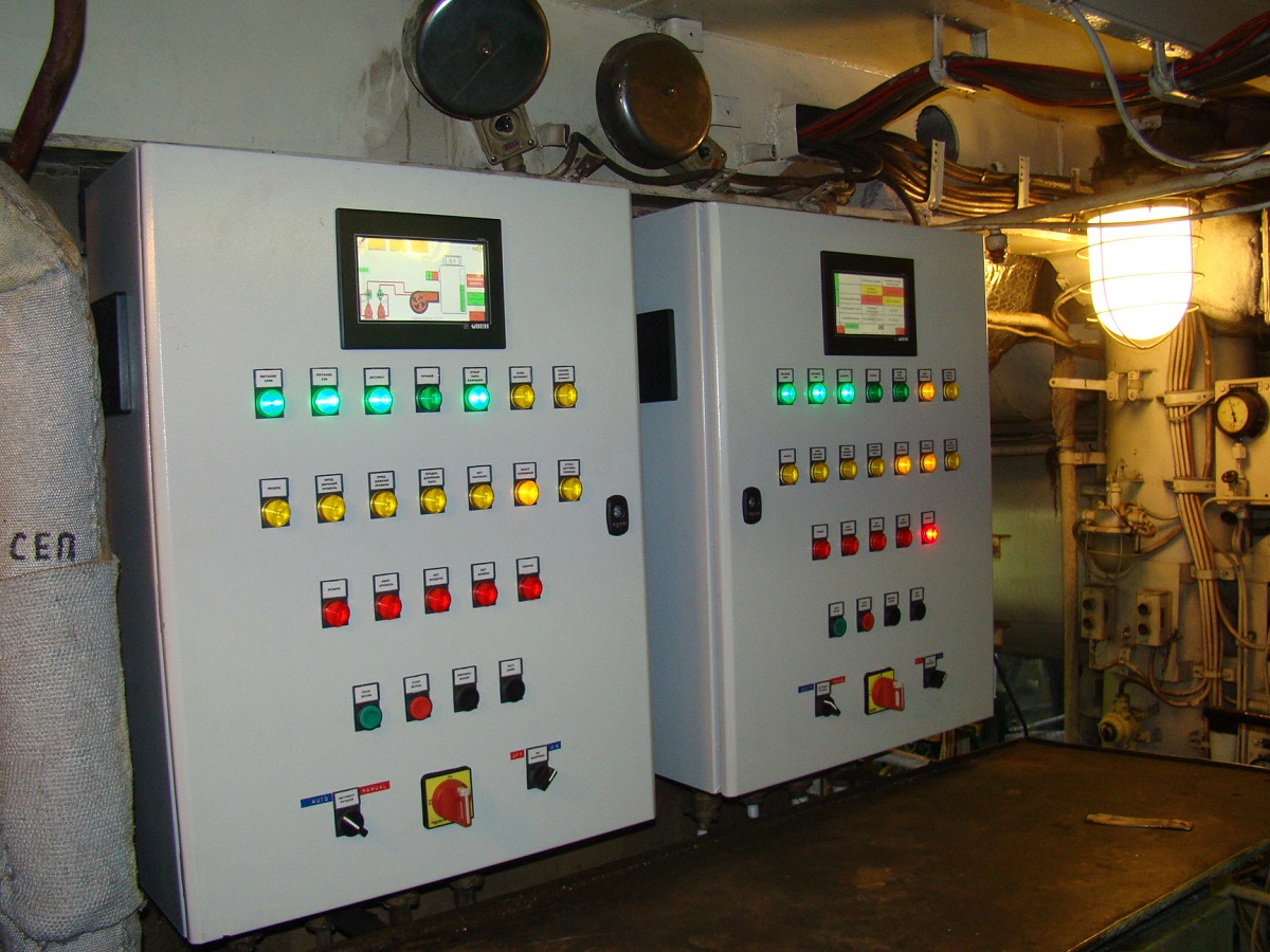 Логическим ядром системы является программируемый логический контроллер отечественного производства ОВЕН ПЛК110-220.60.К и панель оператора ОВЕН СП270, имеющие Свидетельство о типовом одобрении ПЛК (Российский морской регистр судоходства) РМРС. Наличие графических панелей ОВЕН СП270 на местном посте управления и в ЦПУ повышает информативность системы, тем самым значительно облегчая обслуживающему персоналу понимание процессов работы системы и поиск возникших неисправностей. Функциональная схема и принцип работы системы остались без изменений и полностью соответствуют штатной схеме. Быстроразъемные подходящие соединения также остались без изменений, что обеспечило полную взаимозаменяемость существующей системы управления на новую.