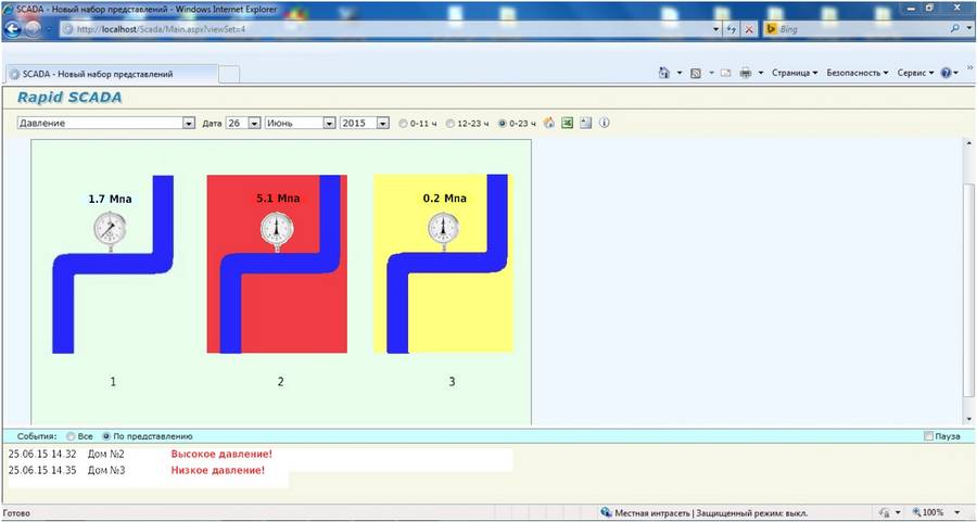 Результат: результатом проекта была система диспетчеризации, которая позволяет видеть на одном экране стояки и давление в них. При сбросе давления на рабочее место диспетчера выводится сигнал тревоги и дежурный сантехник направляется на объект.