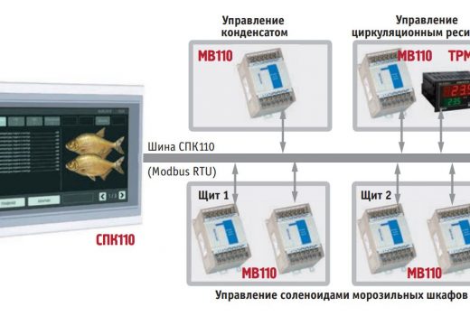 Шесть модулей дискретного ввода ОВЕН MB110-8ДФ служат для сбора сигналов с соленоидов морозильных шкафов и параметров с групп конденсаторов, а также для контроля состояния насосов хладагента. Одноканальный регулятор ОВЕН ТРМ201 контролирует уровень хладагента, состояние датчика уровня хладагента и циркуляционного ресивера.