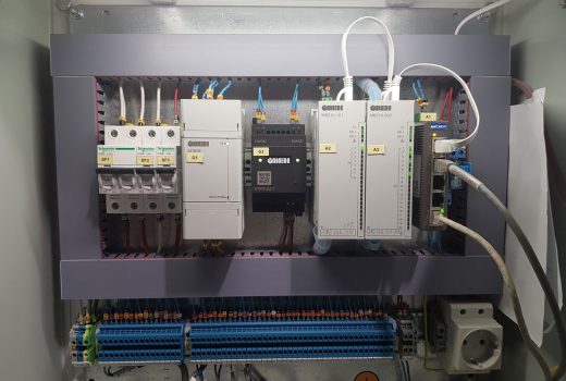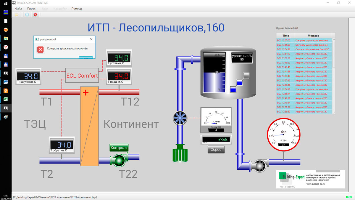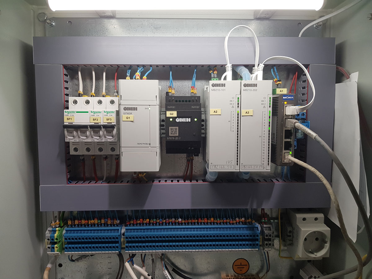 Автоматическое управление системой осуществляет контроллер стороннего производителя. Модули ввода/вывода с Ethernet ОВЕН МВ210-101 (8 AI) и ОВЕН МВ210-202 (20 DI) используются для сбора сигналов с датчиков и передачи их в SCADA-систему. Подключение к контроллеру осуществляется через разъём RJ45, и всё это подключено через коммутатор Moxa в сеть СКС. На компьютере у главного энергетика установлена SCADA-система TeslaSCADA, которая забирает данные по протоколу Modbus TCP. На графическом экране компьютера реализована интуитивно понятная графика технологического процесса с журналом событий и журналом потребления холодной воды.